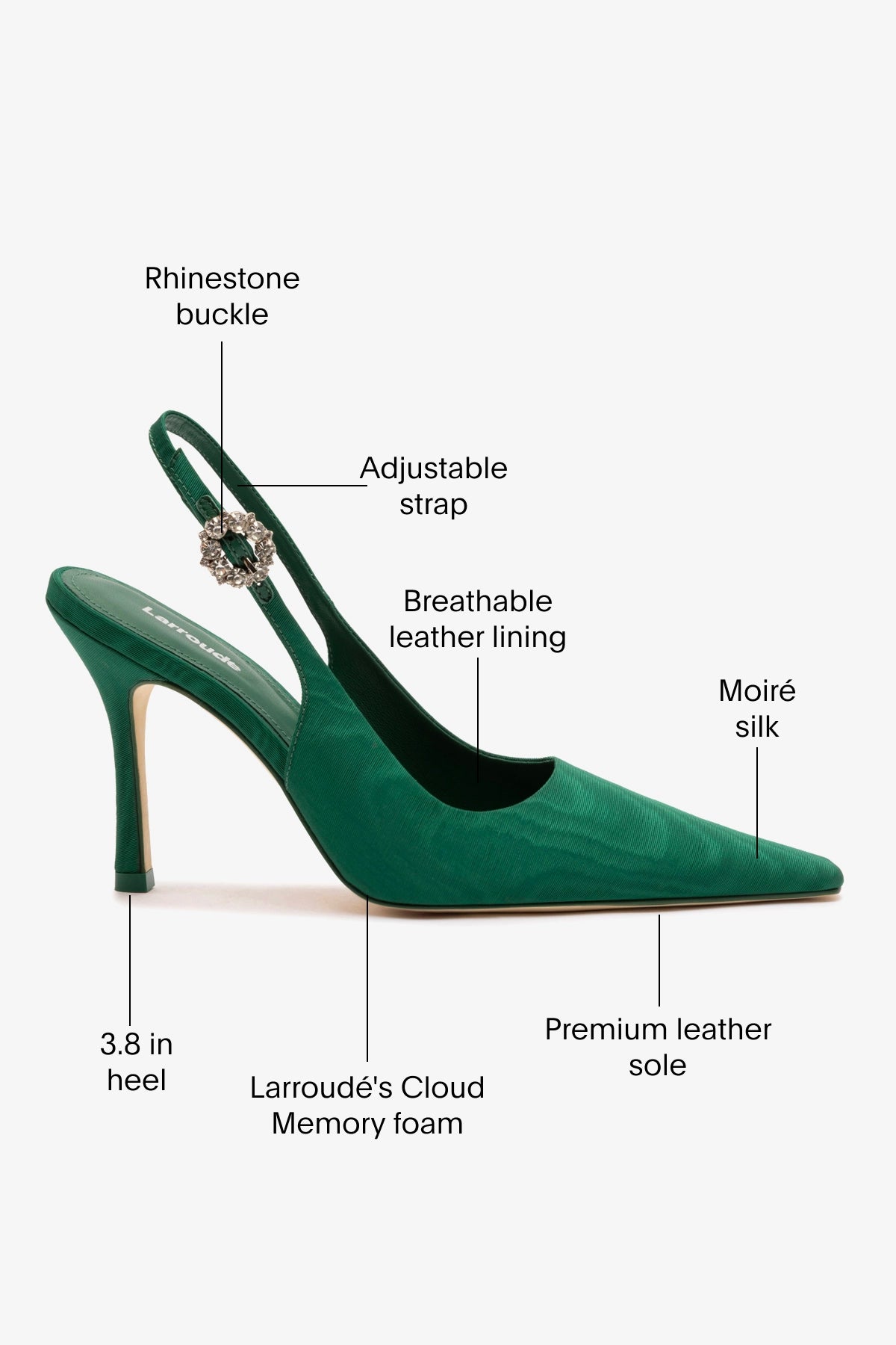 The Carine pump—in homage to the iconic Carine Roitfeld—is our vision of feminine power, reimagined in Moiré silk. Featuring a sharp pointed toe and stiletto heel, it defines the night's silhouette, while the crystal-adorned buckle is the finishing touch for celebrating the festive period.