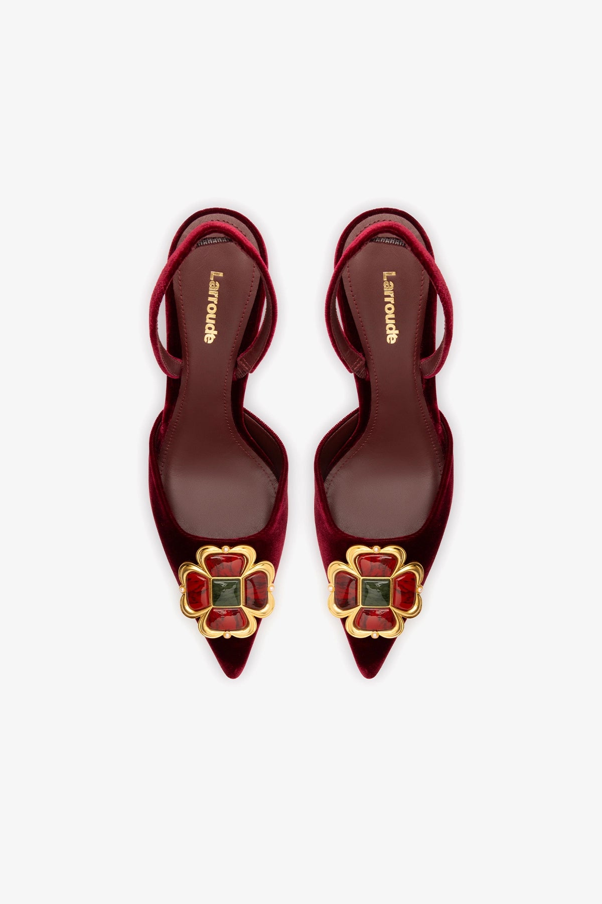 Meet the Chrissy, our newest pump inspired by the exuberant 80s couture of Christian Lacroix—think rich textures, bold details, and unapologetic glamour. Crafted in plush velvet and finished with a sculptural ornament, it’s made to steal the spotlight (and maybe a few hearts along the way).