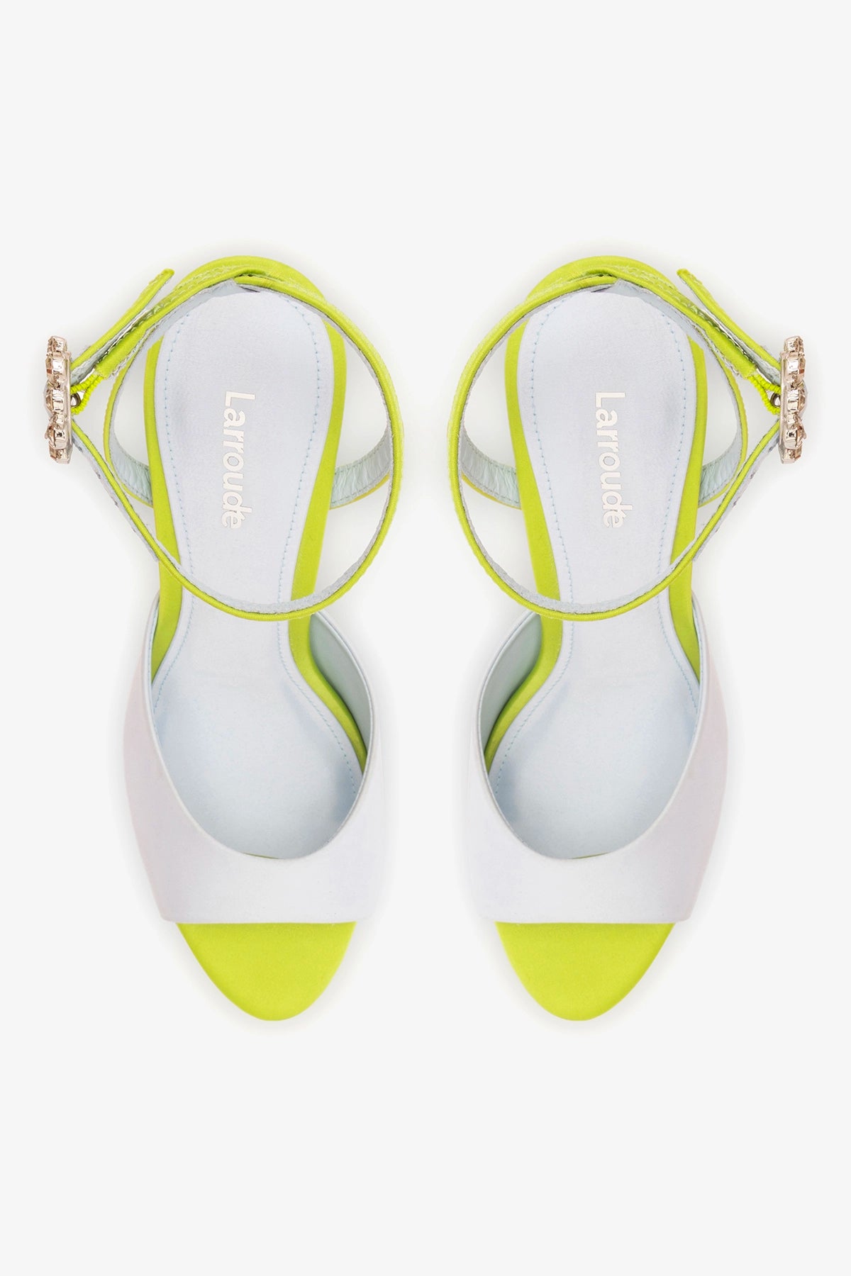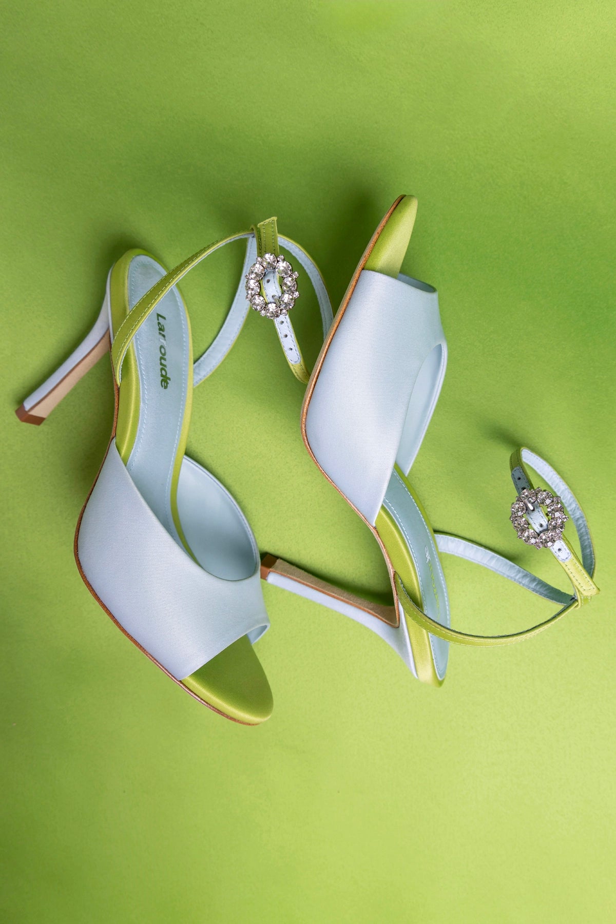 Open-toe sandal crafted in powder blue satin with contrasting green trim, featuring a slim stiletto heel and delicate ankle strap. A crystal-embellished buckle adds a refined statement detail while maintaining a clean, sculpted silhouette.
