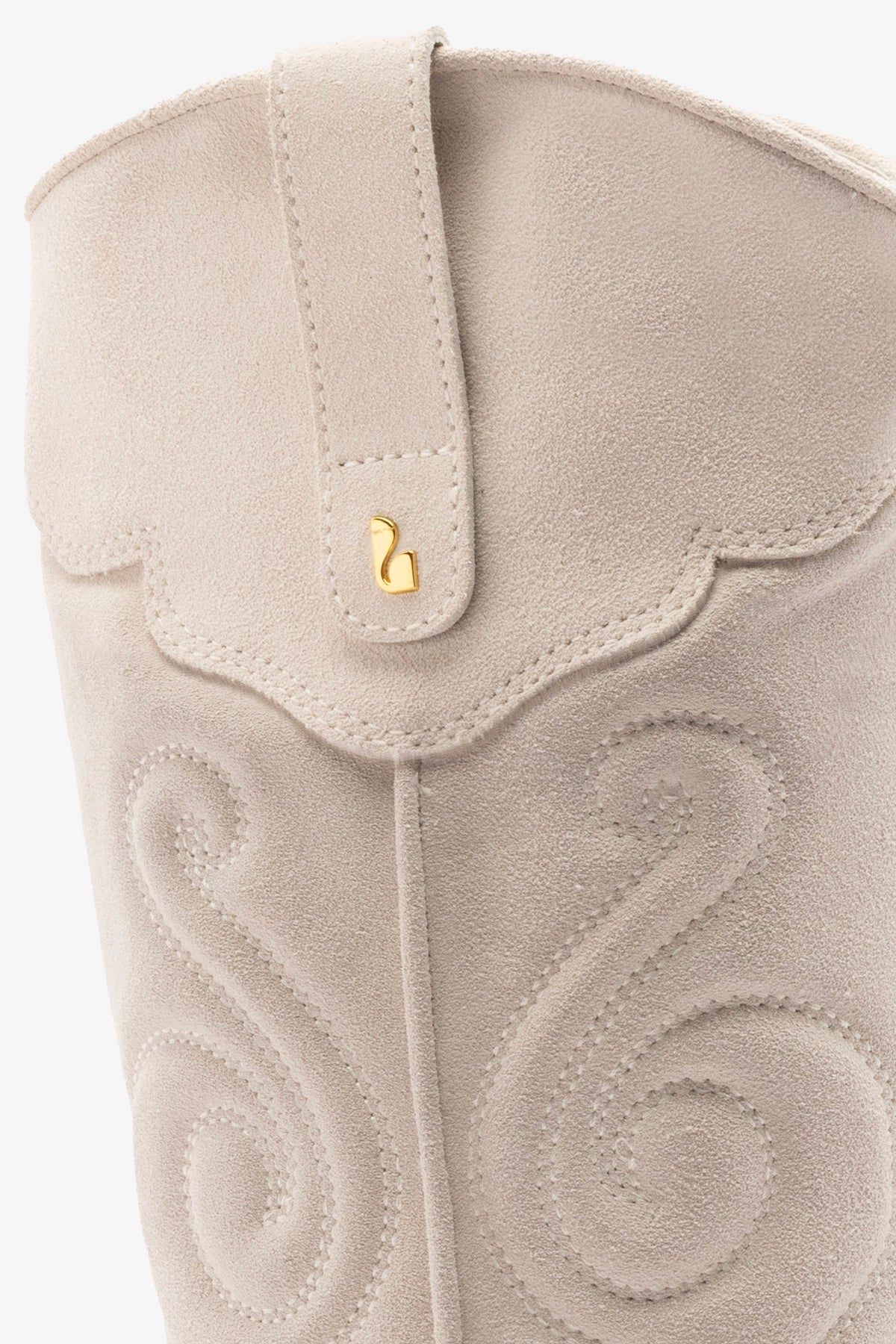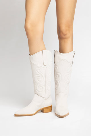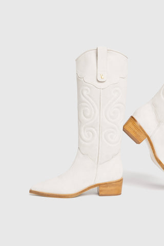 This reimagined Western boot brings classic cowboy energy into the now with rich suede, sleek paneling, and a modern, sculpted silhouette. With its pointed toe, low stacked heel, and bold details, it’s the kind of boot that feels ready to roam.
