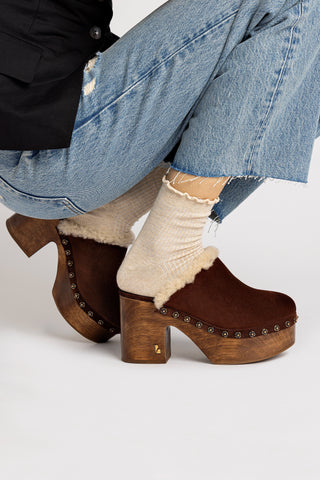 Miso Wooden Platform Clog In Brown Suede And Natural Shearling