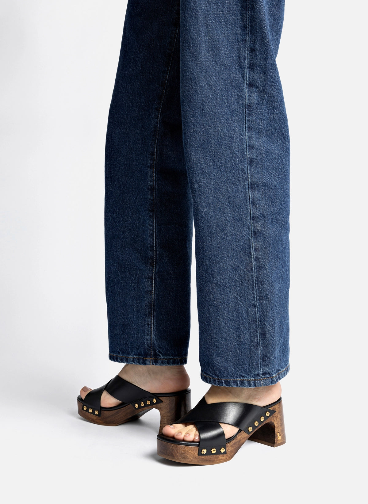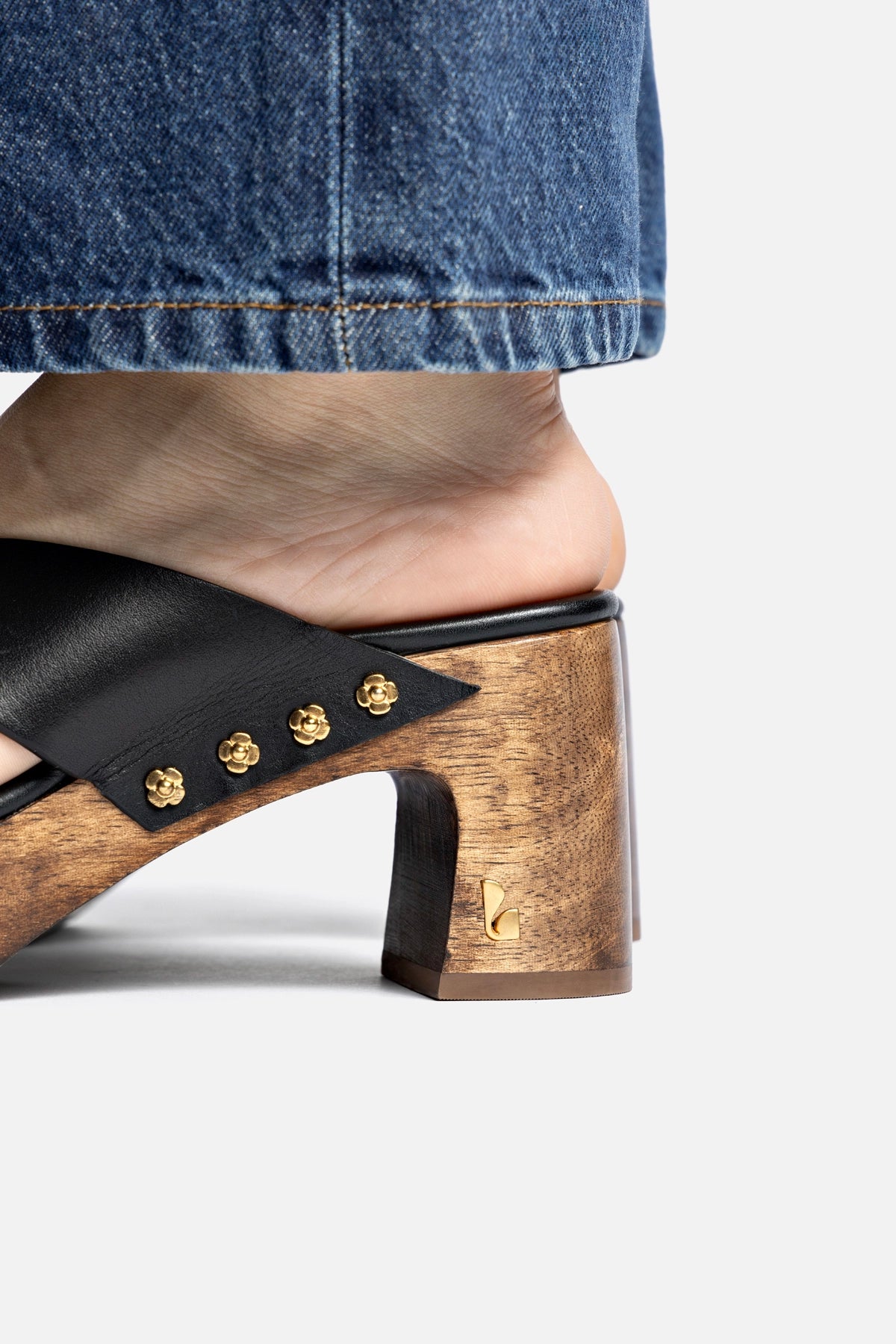 Vintage charm comes alive in the Talitha Dolly Mule, a tribute to the 70s. Wide straps in soft leather sit atop a sturdy, wooden block heel, providing both height and stability. Small gold floral appliqués add an unexpected touch to this powerful silhouette.
