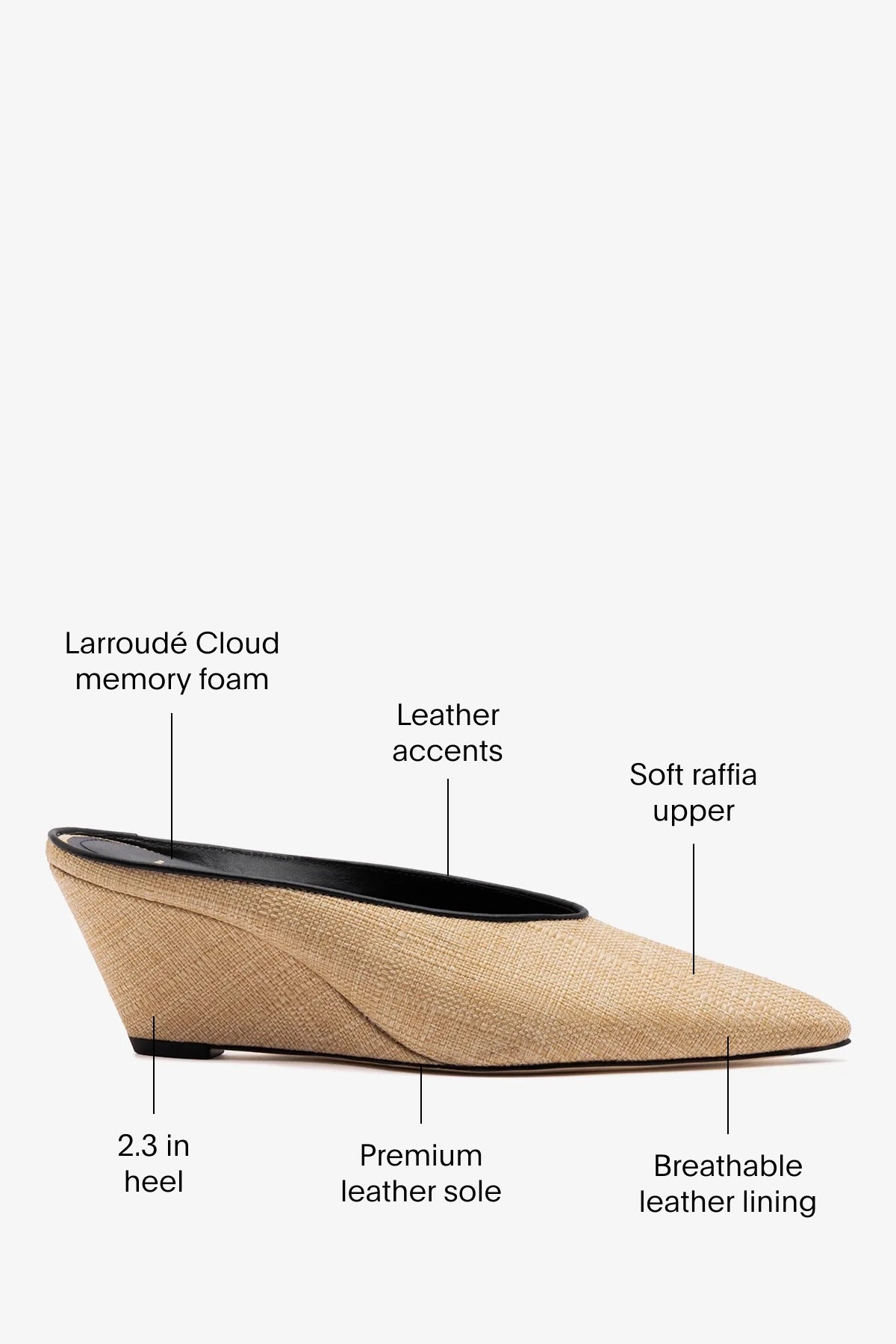 Pointed-toe mule crafted from beige raffia, featuring a clean silhouette and a low wedge heel for everyday comfort. The minimalist design elongates the look and transitions easily from casual to polished outfits.