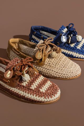 Cyprus Crochet Boat Shoe In Natural Crochet and Russet Leather