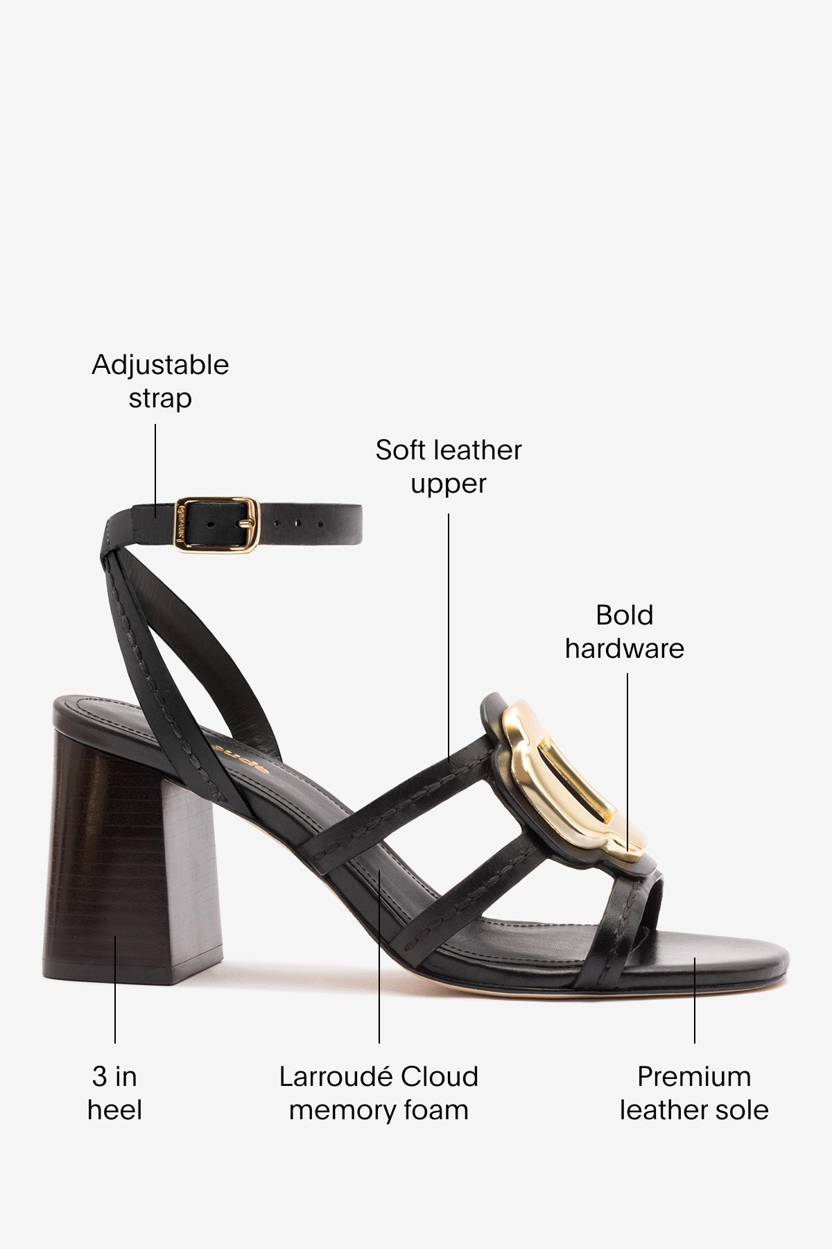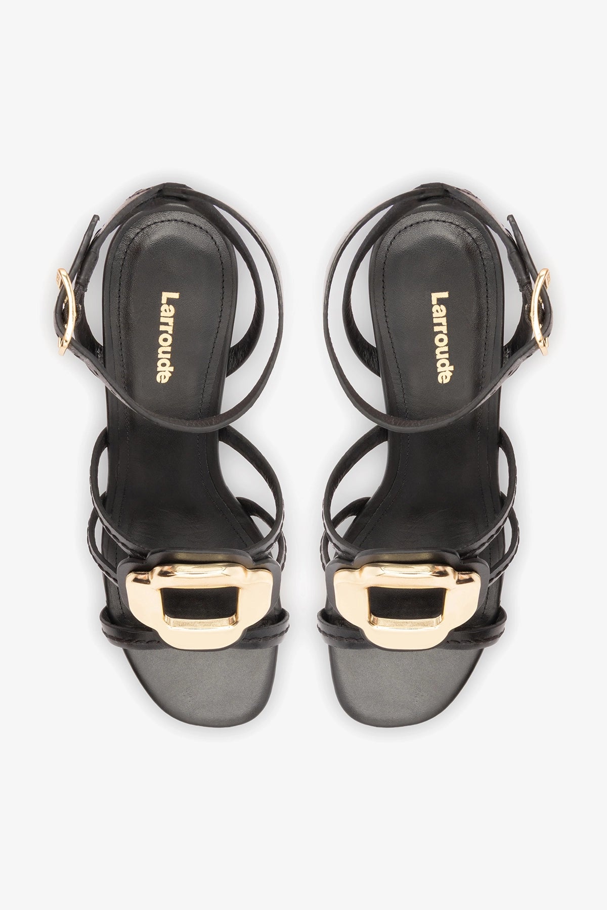 Block-heel sandal crafted in smooth black leather with slim straps and visible stitching details. Features oversized gold-tone hardware across the upper, adding a bold statement element, while the structured block heel ensures stability and comfort.