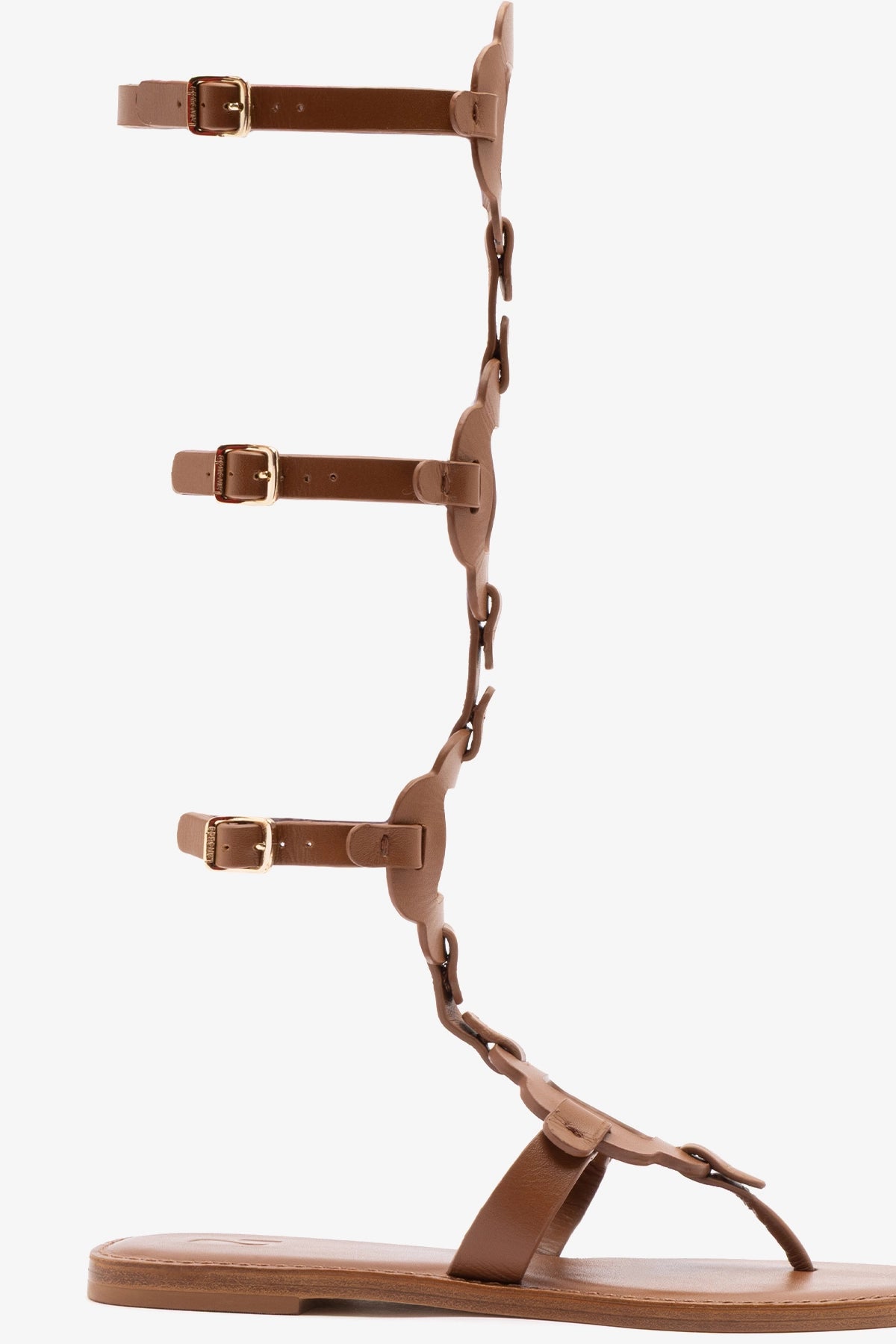 Caramel leather gladiator sandal in brown leather, featuring cutout straps and adjustable buckles for a secure fit. The flat sole offers all-day comfort, while the bold silhouette adds character to warm-weather looks.