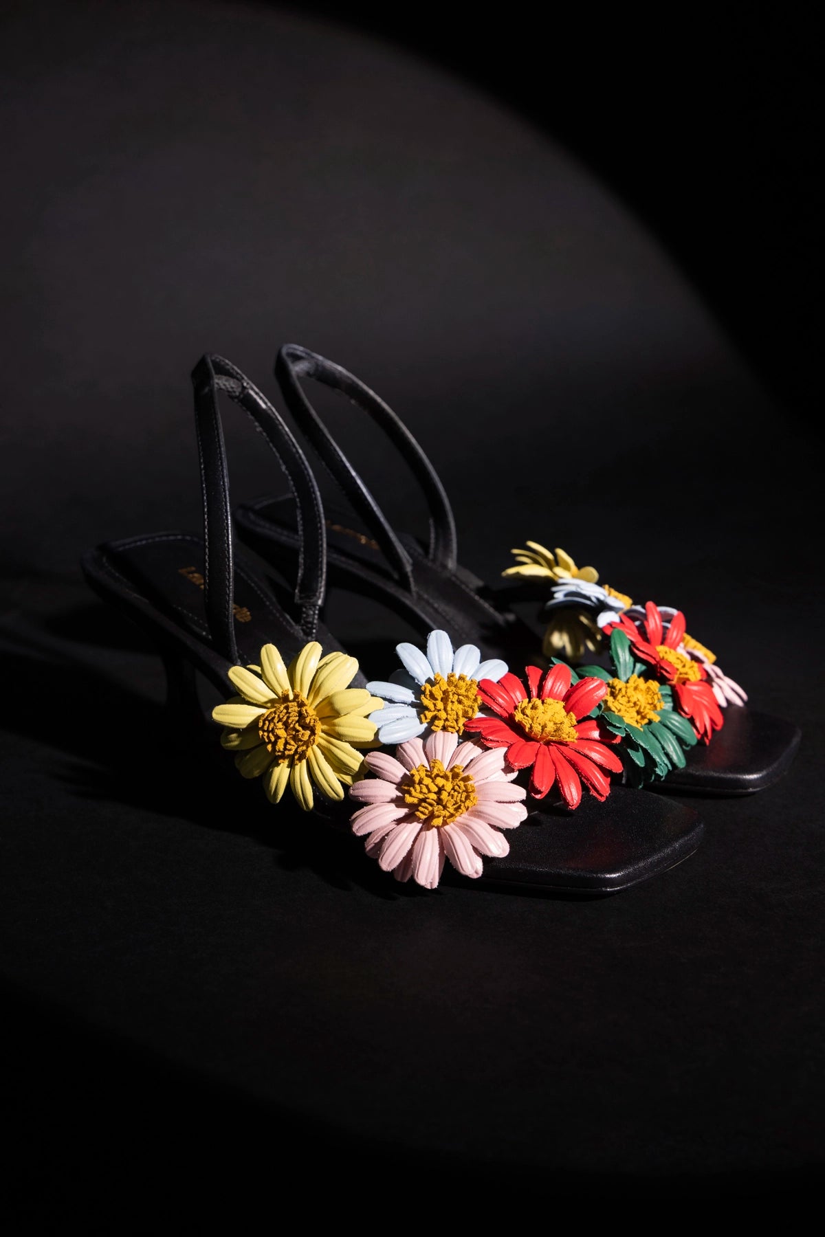 Mid-heel slingback sandal crafted from black leather, featuring dimensional floral appliqués that add a statement touch. The balanced heel offers comfort, while the open silhouette keeps the look light and feminine.