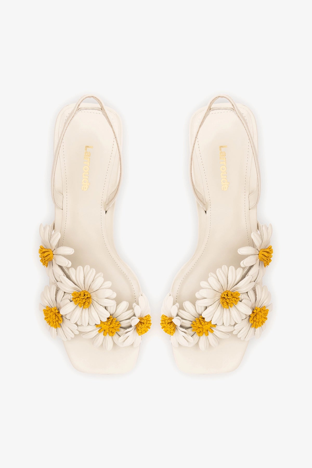 Mid-heel slingback sandal crafted from ivory leather, featuring dimensional floral appliqués that add a statement touch. The balanced heel offers comfort, while the open silhouette keeps the look light and feminine.