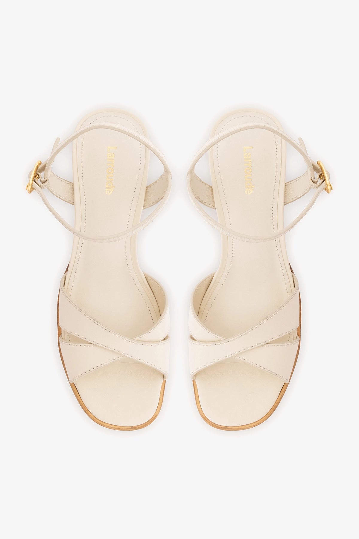Low block-heel sandal crafted from ivory leather, featuring clean lines and an ankle strap for a secure fit. The balanced heel offers comfort and stability, making it an easy everyday choice.