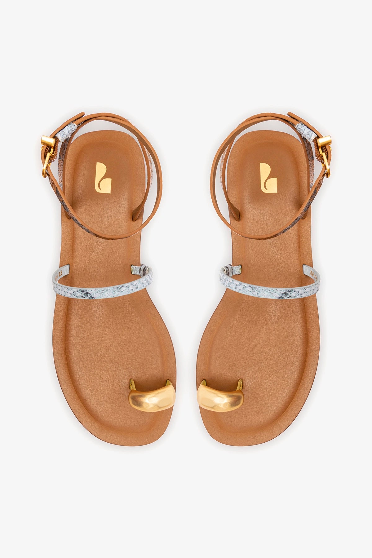 Inspired by the effortless charm of the French coast, this flat sandal blends a relaxed summer mood with refined details. The snakeskin-effect adds texture, while the delicate ankle straps and metallic accent at the toe bring balance and subtle elegance. Designed for warm days, it’s lightweight, comfortable, and easy to wear from morning to night.
