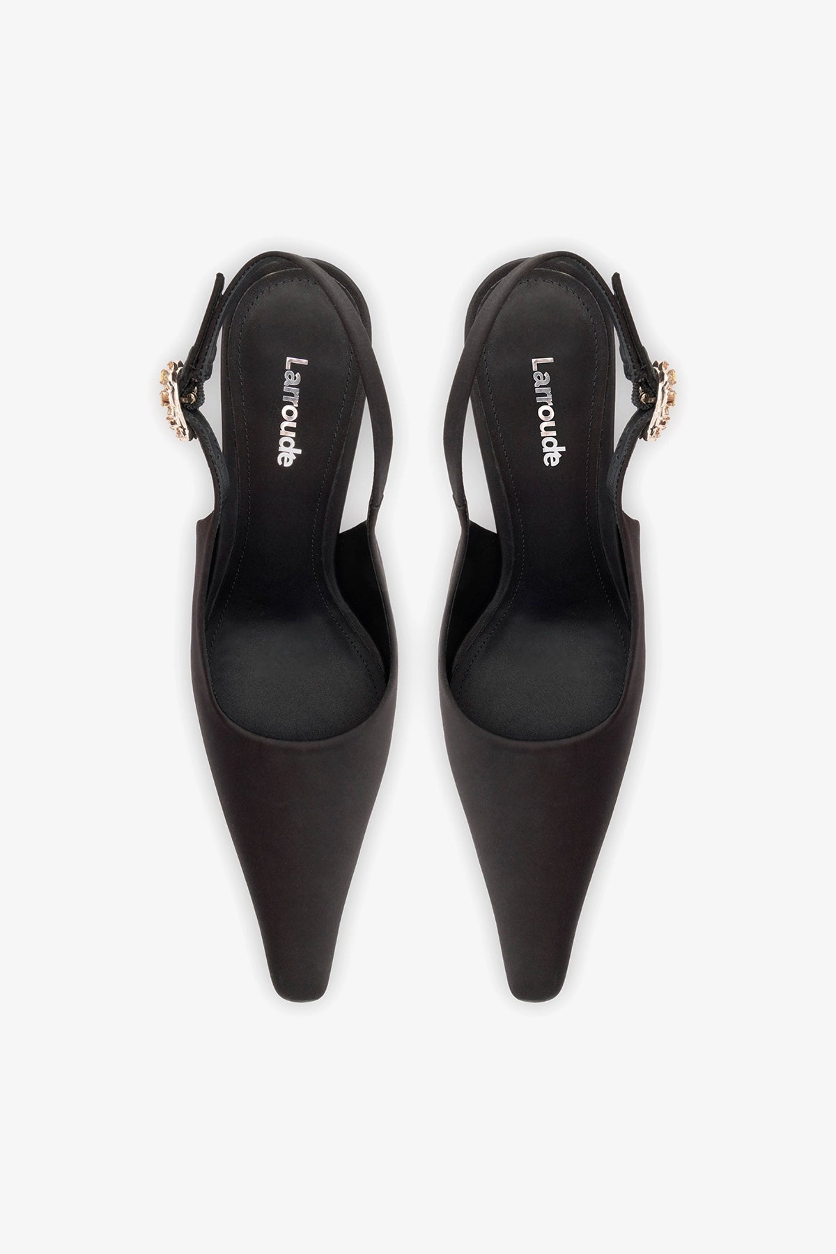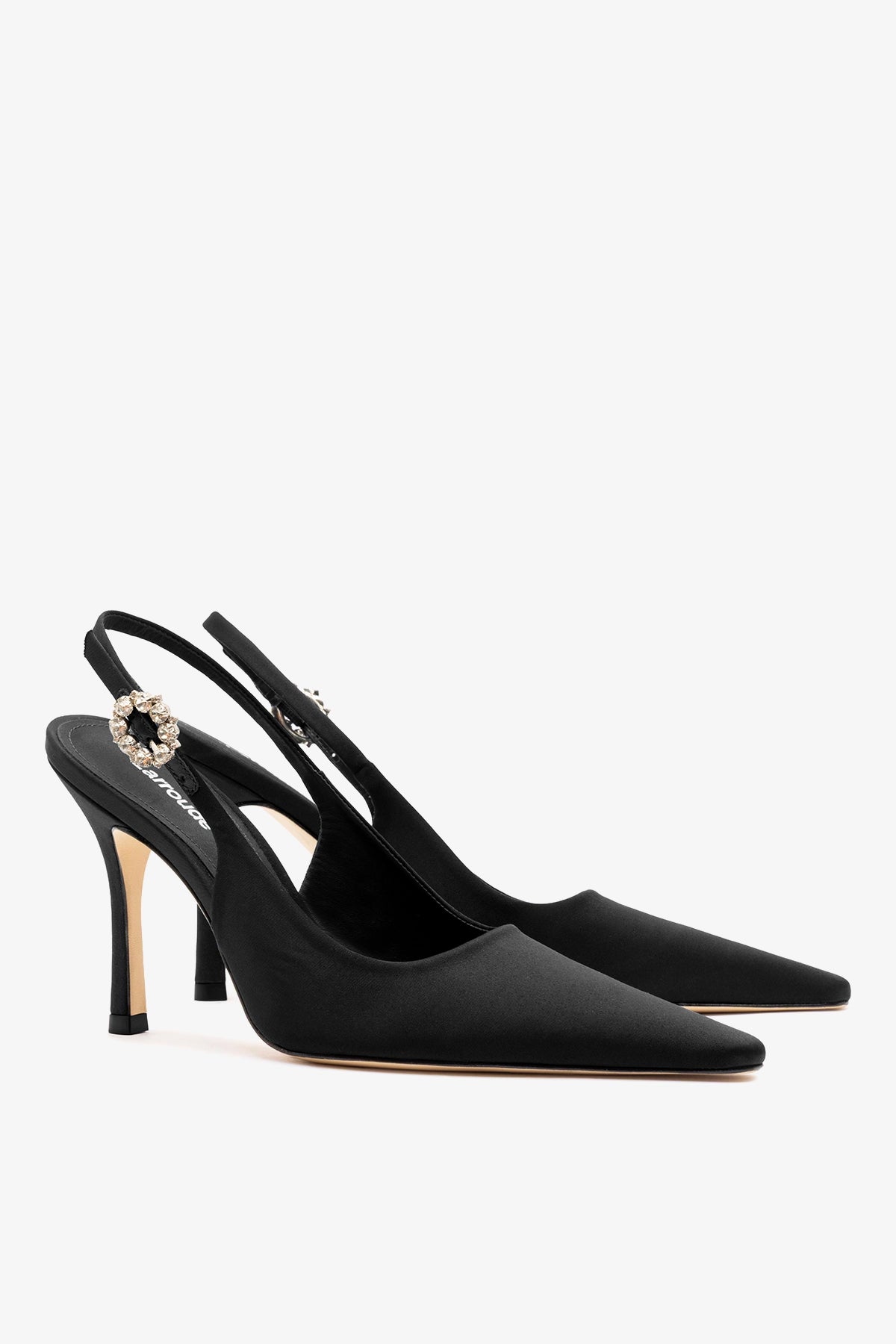 Slingback pump crafted in black satin with a pointed toe and slim stiletto heel. Features a delicate strap with crystal-embellished buckle, adding a refined statement detail while ensuring a secure fit.