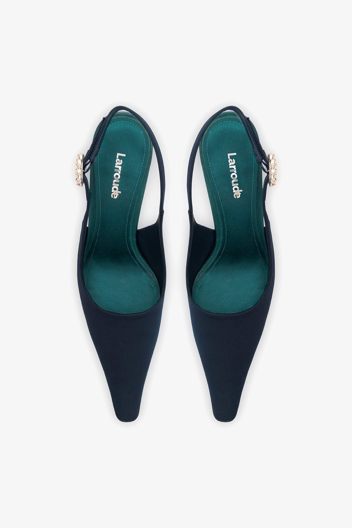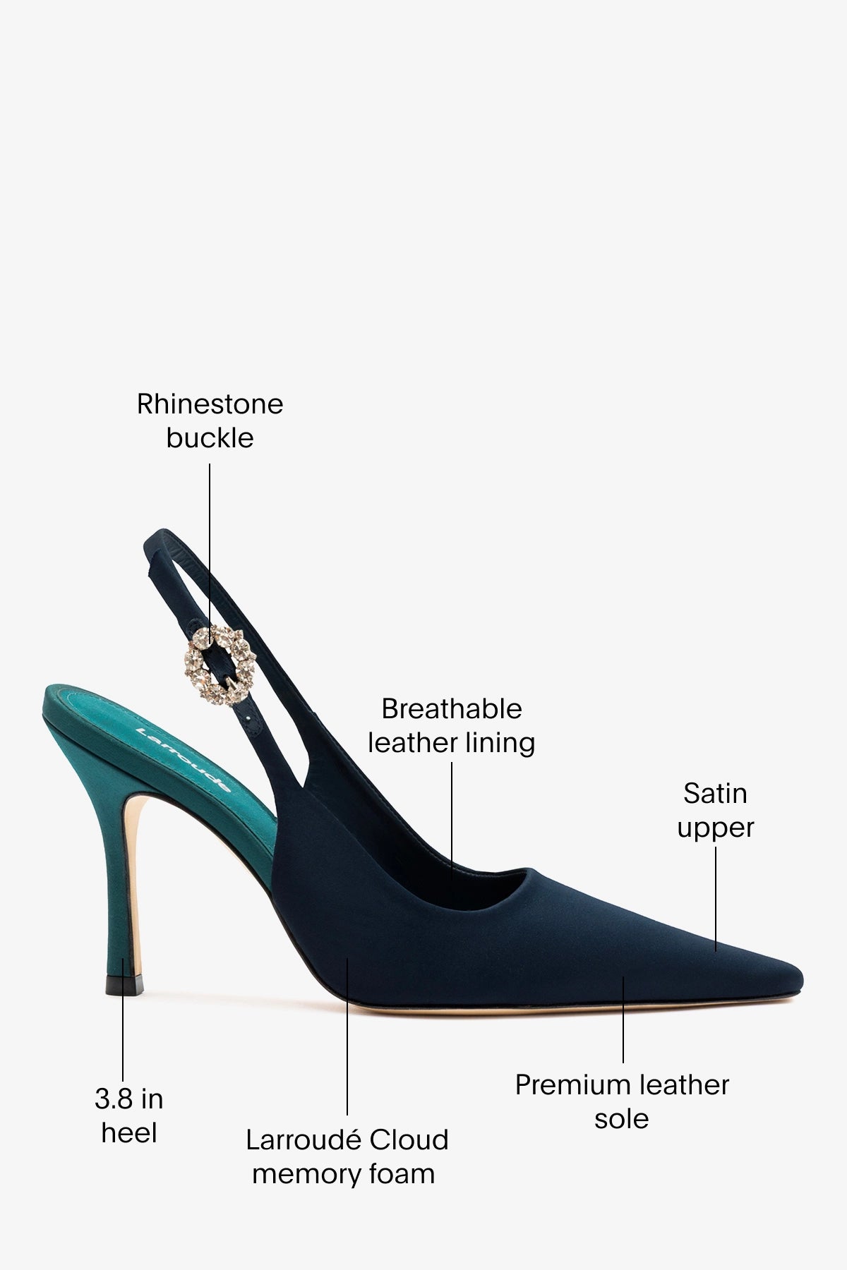 Slingback pump crafted in ocean and teal satin with a pointed toe and slim stiletto heel. Features a delicate strap with crystal-embellished buckle, adding a refined statement detail while ensuring a secure fit.