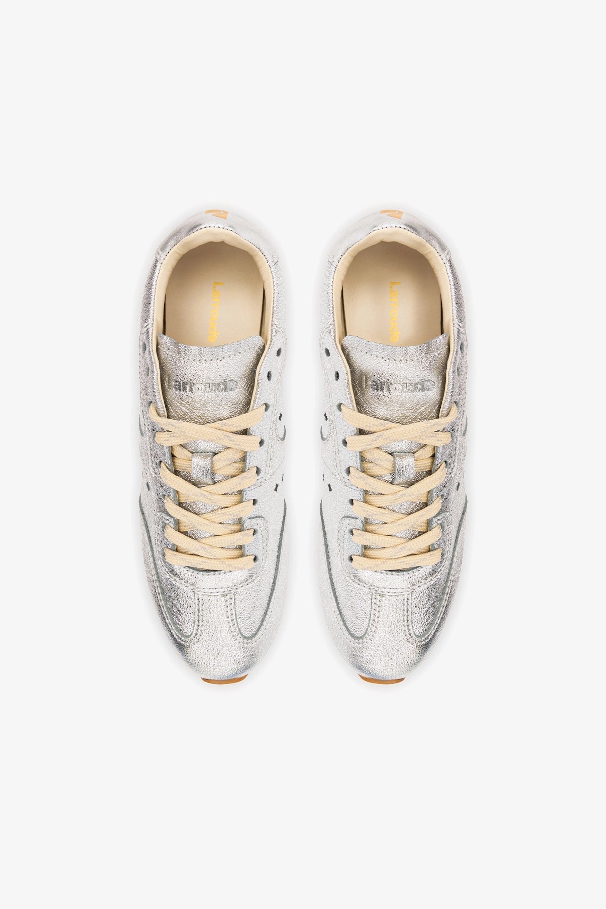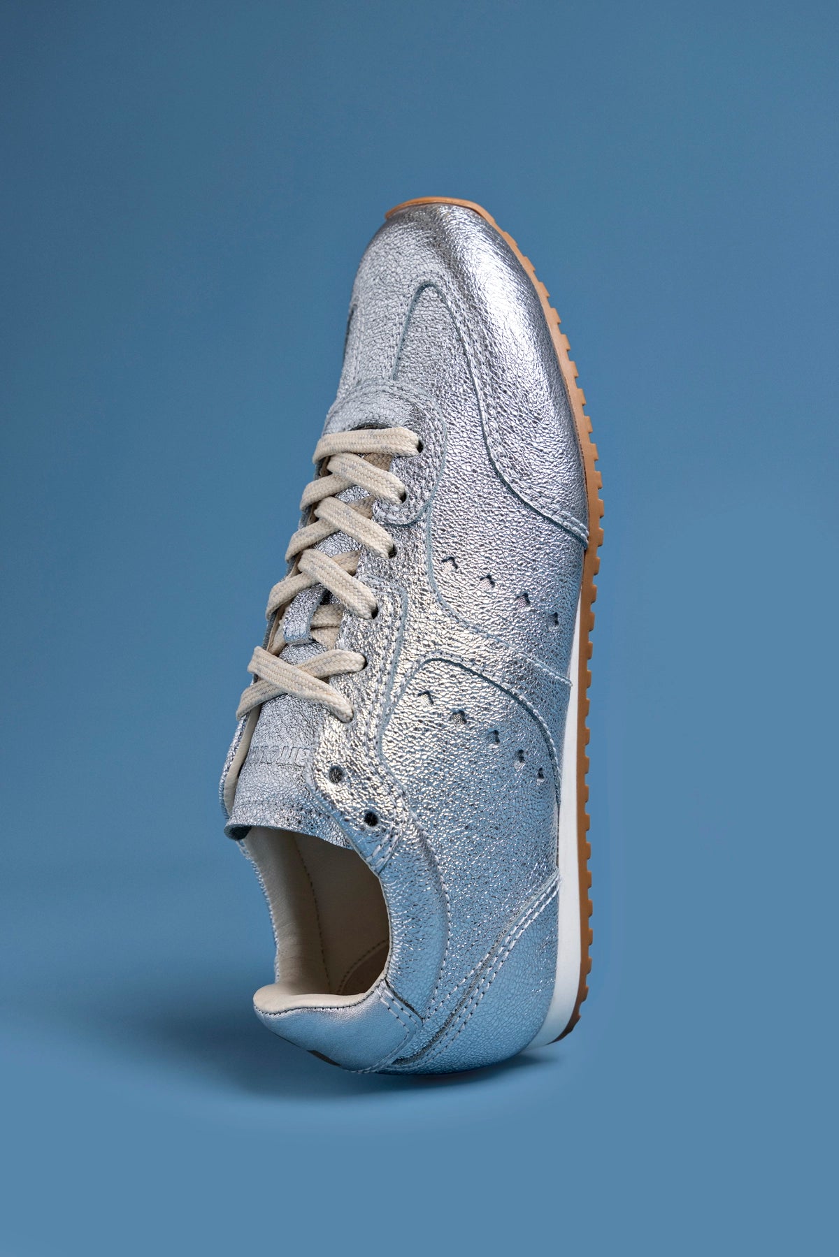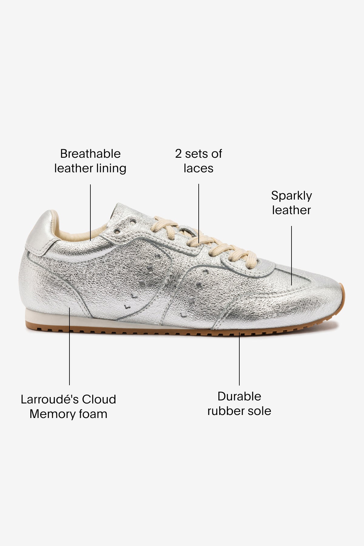 We're in our athletic era! Our best-selling Stella sneaker is proof that comfort and style can coexist—and stand out. Now in a sparkly metallic leather, it brings a modern edge to any look, from city strolls to weekend getaways.
