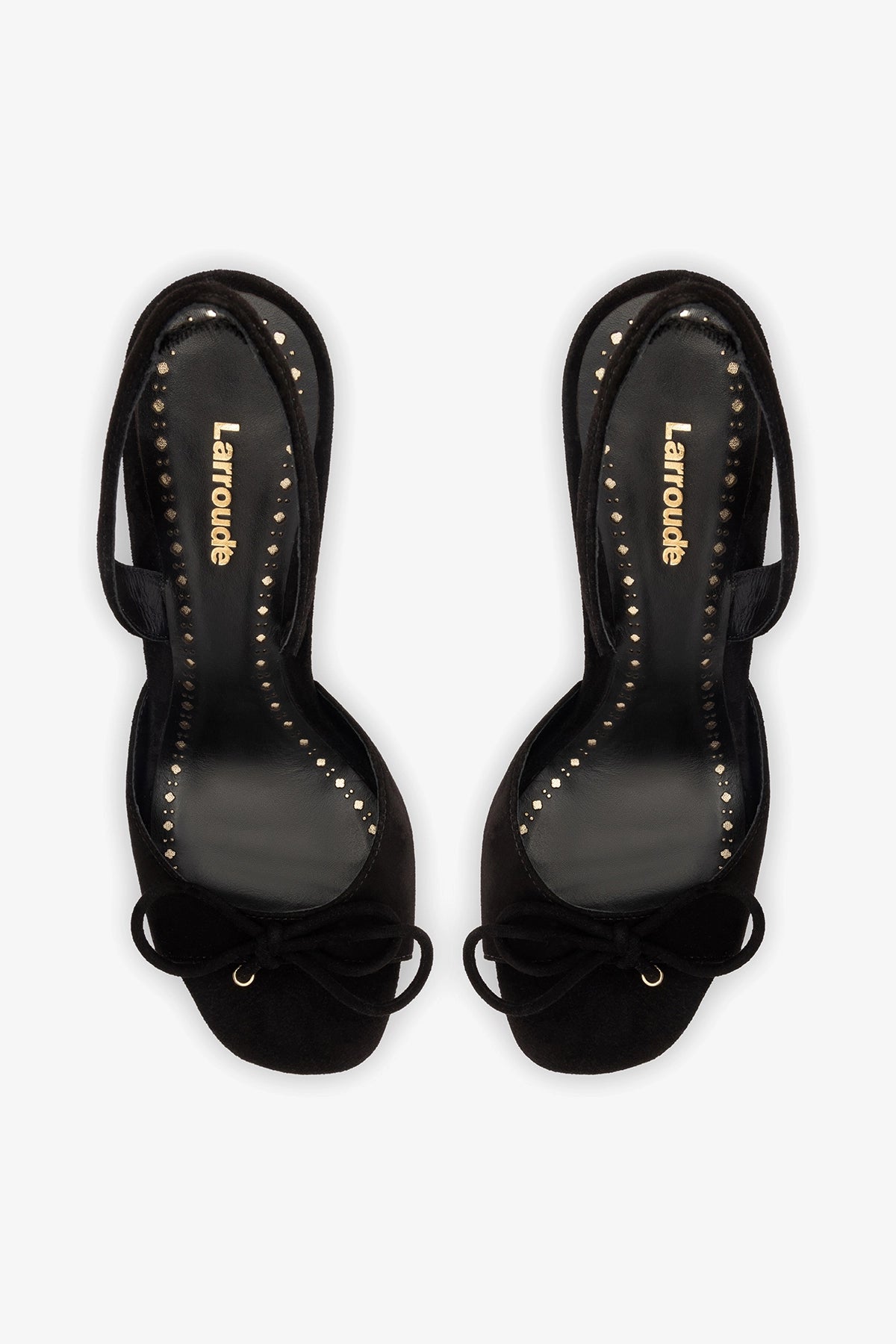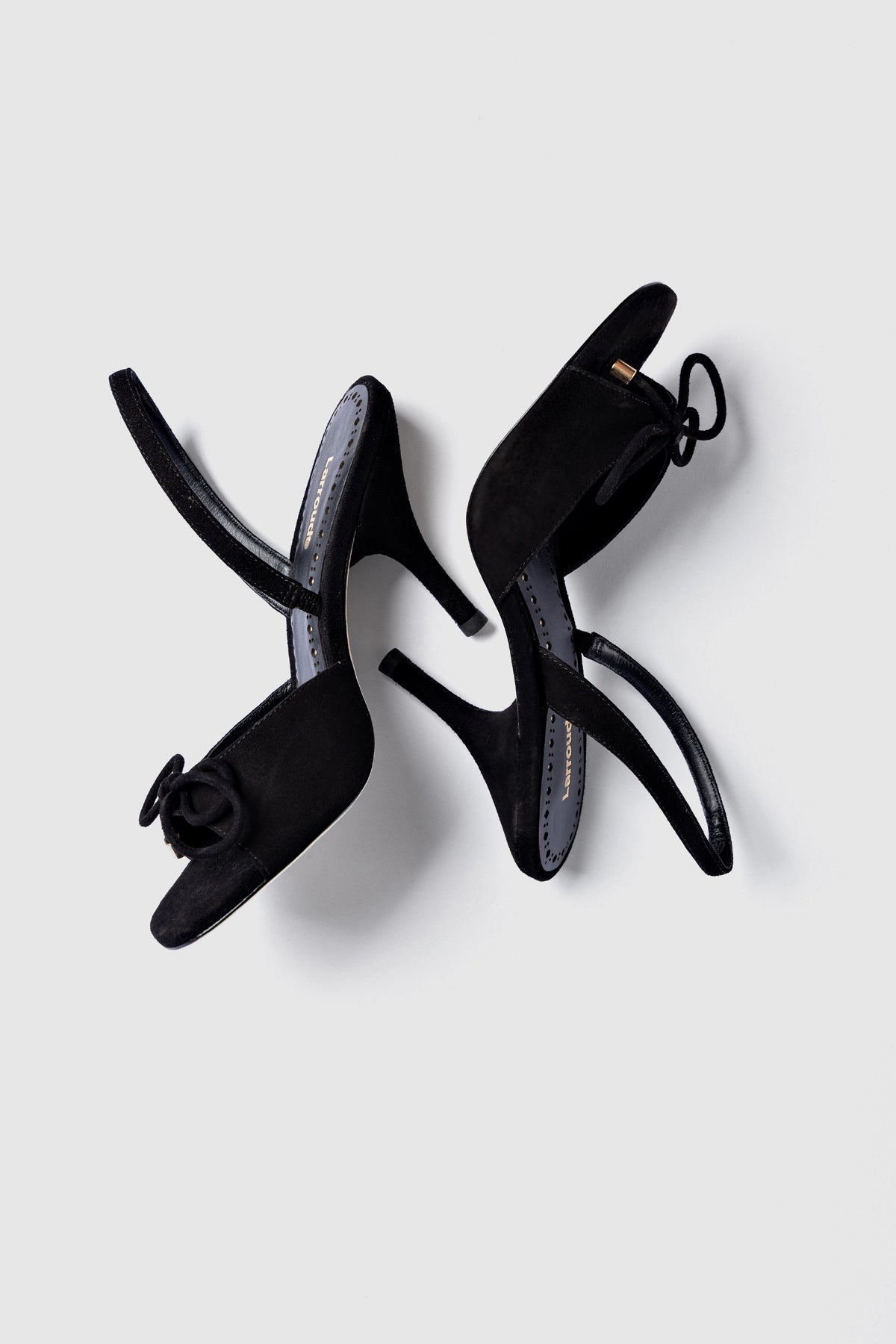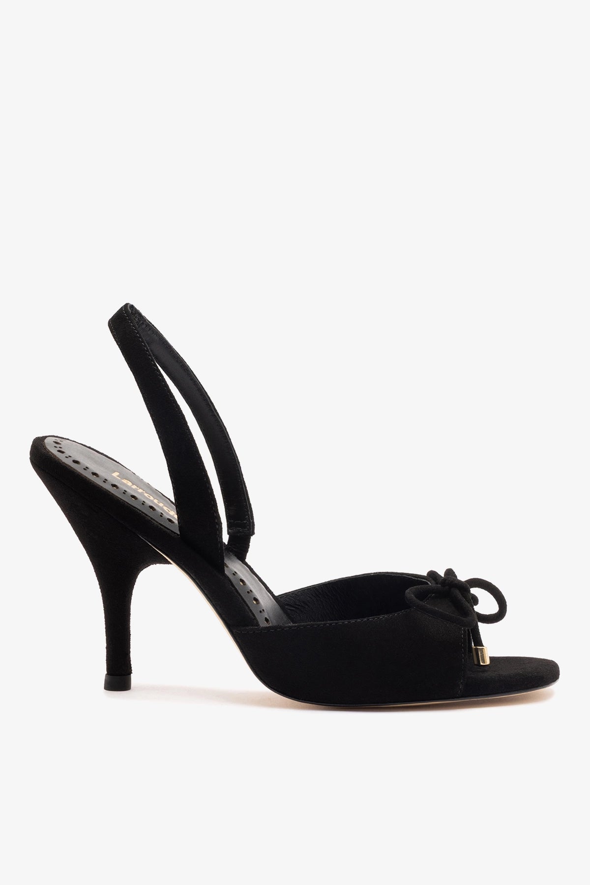Black suede high-heel sandal designed with a sleek slingback silhouette and a delicate bow detail at the front. The soft texture and refined shape make it an easy choice for elevated yet versatile looks.