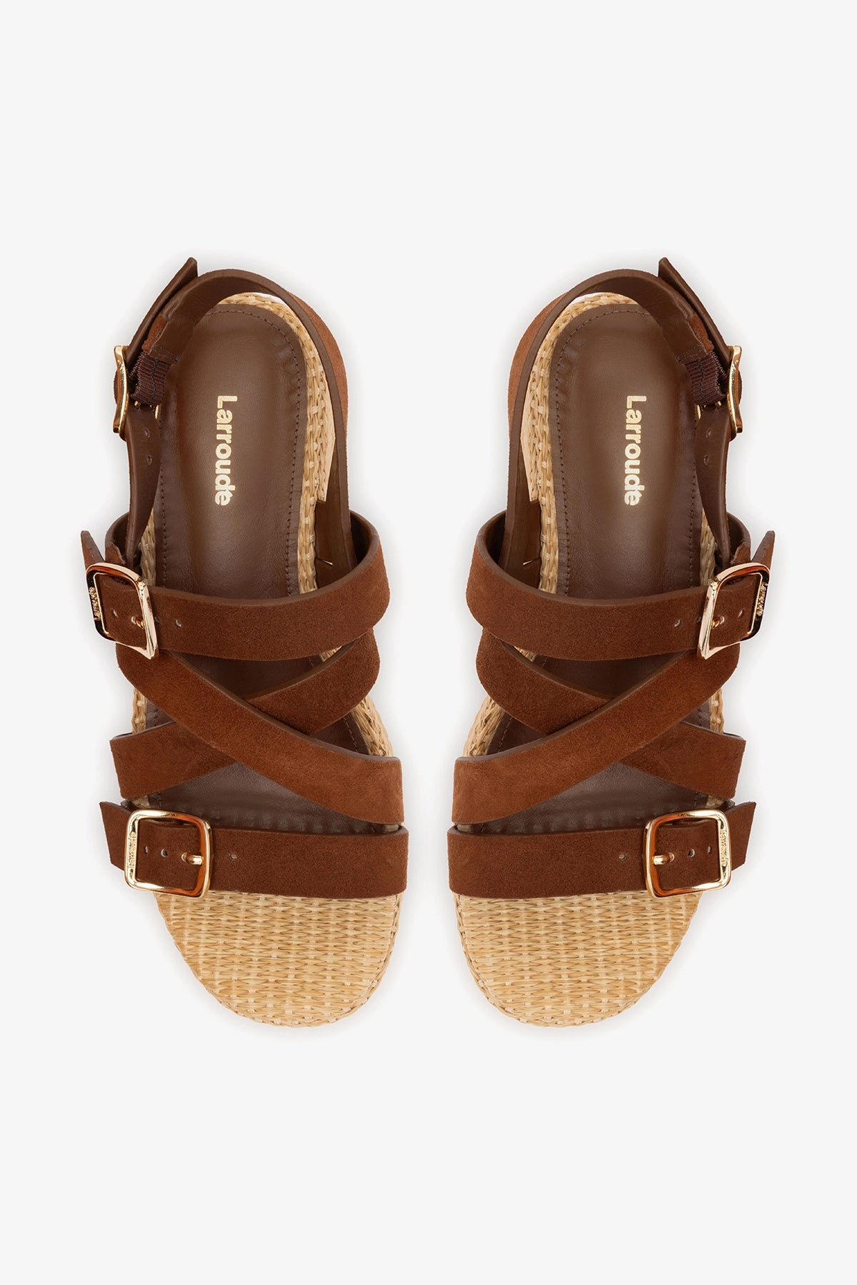 Flatform sandal crafted in brown suede leather with wide crossed straps and adjustable buckle closures. The raffia-wrapped platform sole adds texture and a natural finish, while the flat construction ensures stability and comfort for all-day wear.