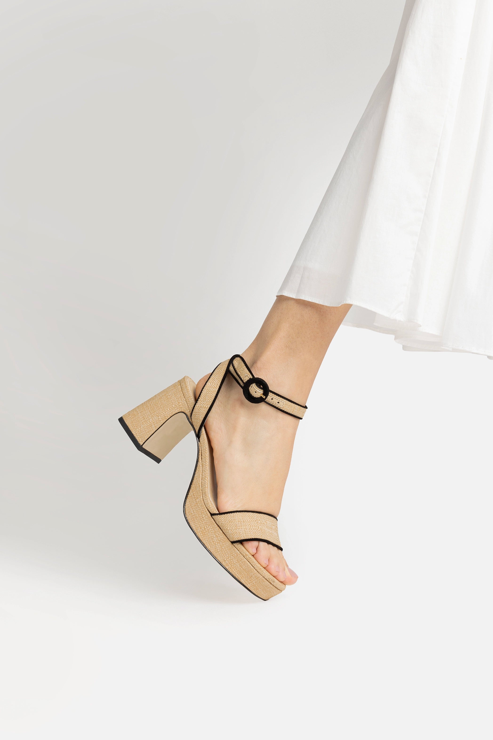 Equal parts party and chic, this leg-lengthening platform is ready for anything. With a comfortably lower platform base and adjustable ankle strap, the Dolly Low in soft beige raffia and elegant black trim contrast is a foolproof option day or night.