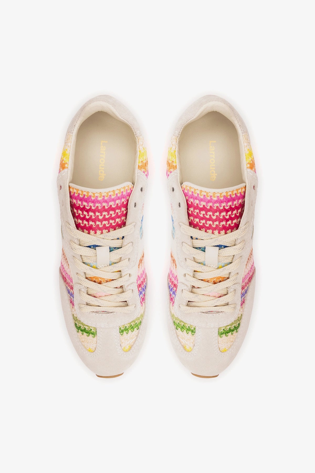Rainbow raffia sneaker featuring neutral-toned suede detailing, designed to combine natural texture with a playful, modern touch. The lightweight construction ensures everyday comfort, while the rainbow effect adds visual interest to casual looks.