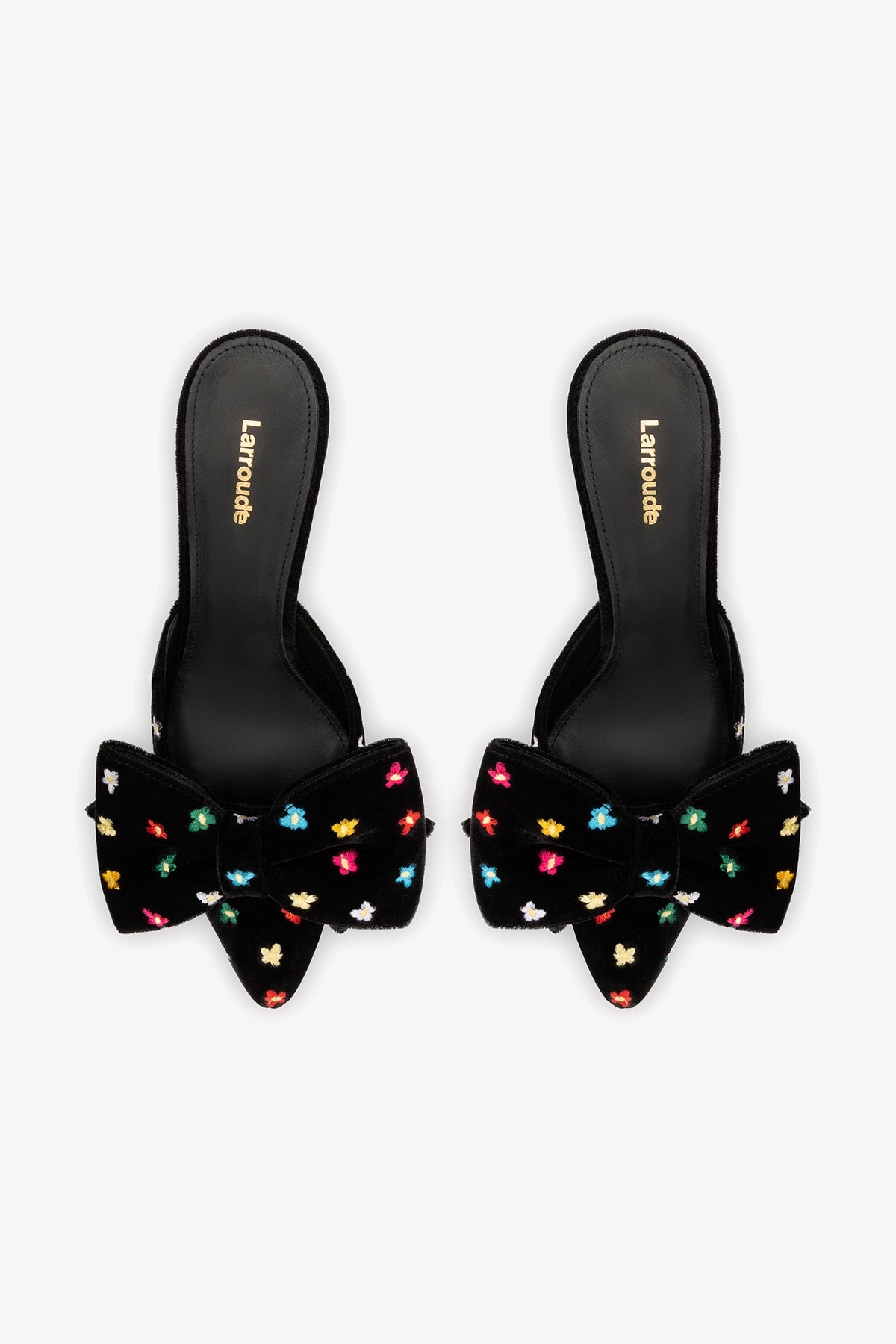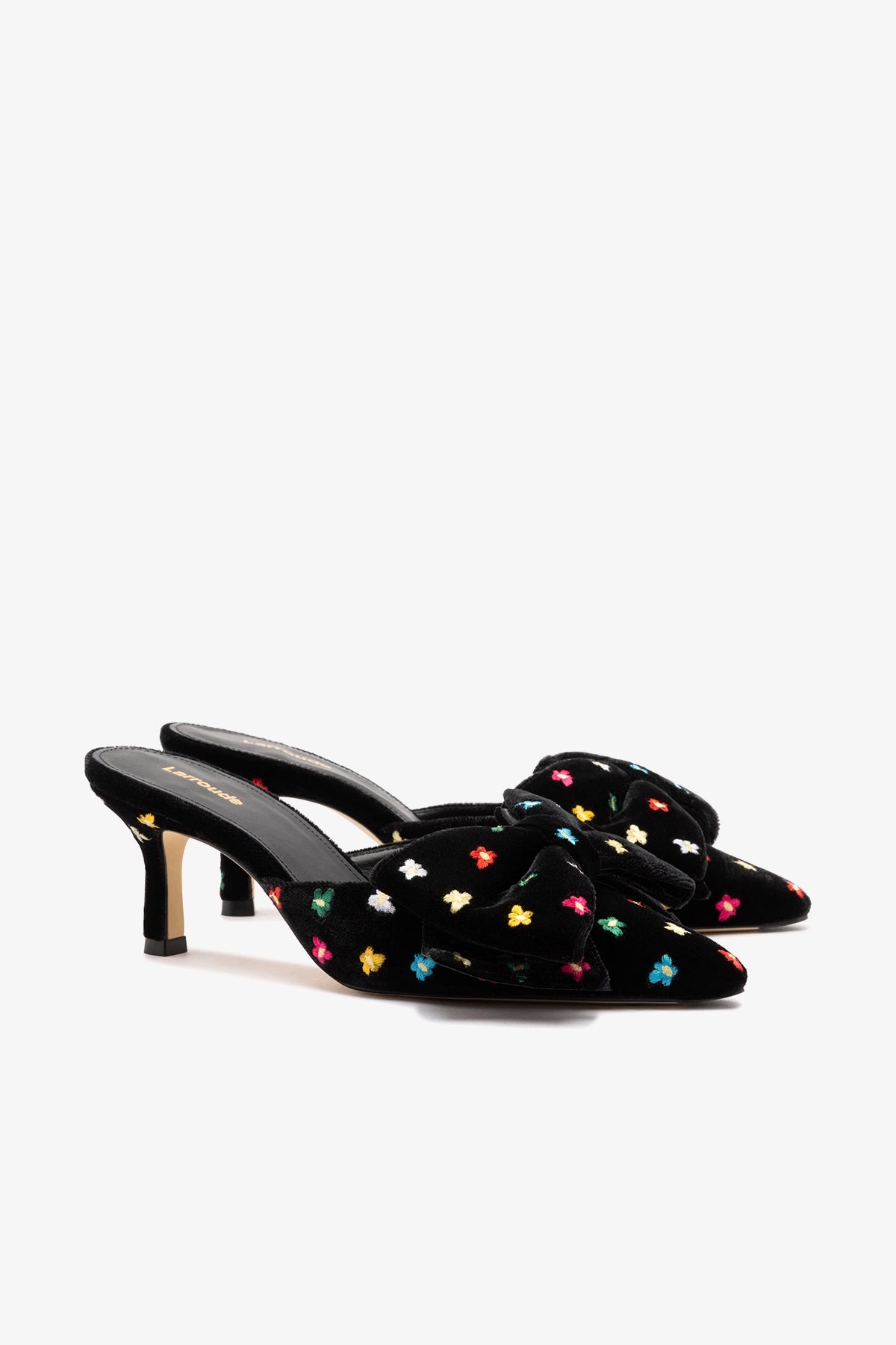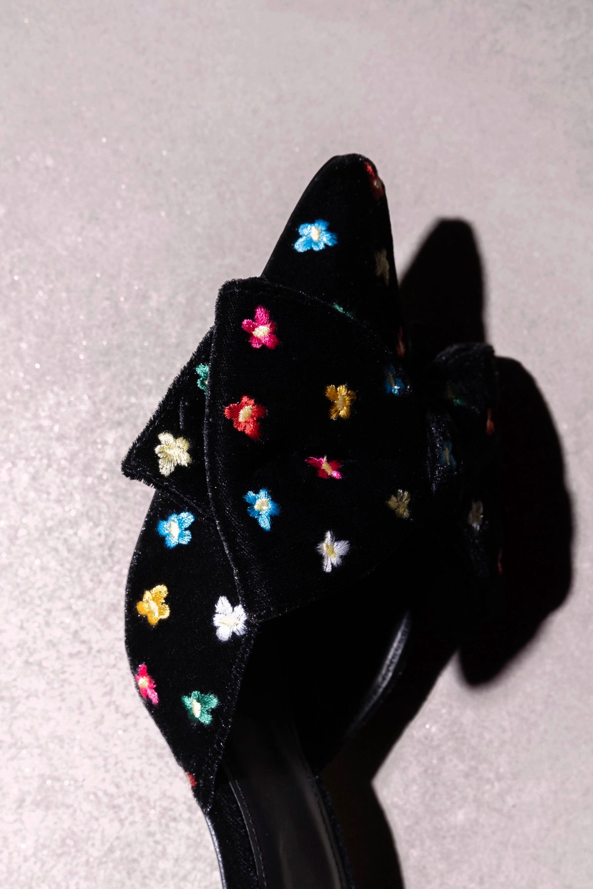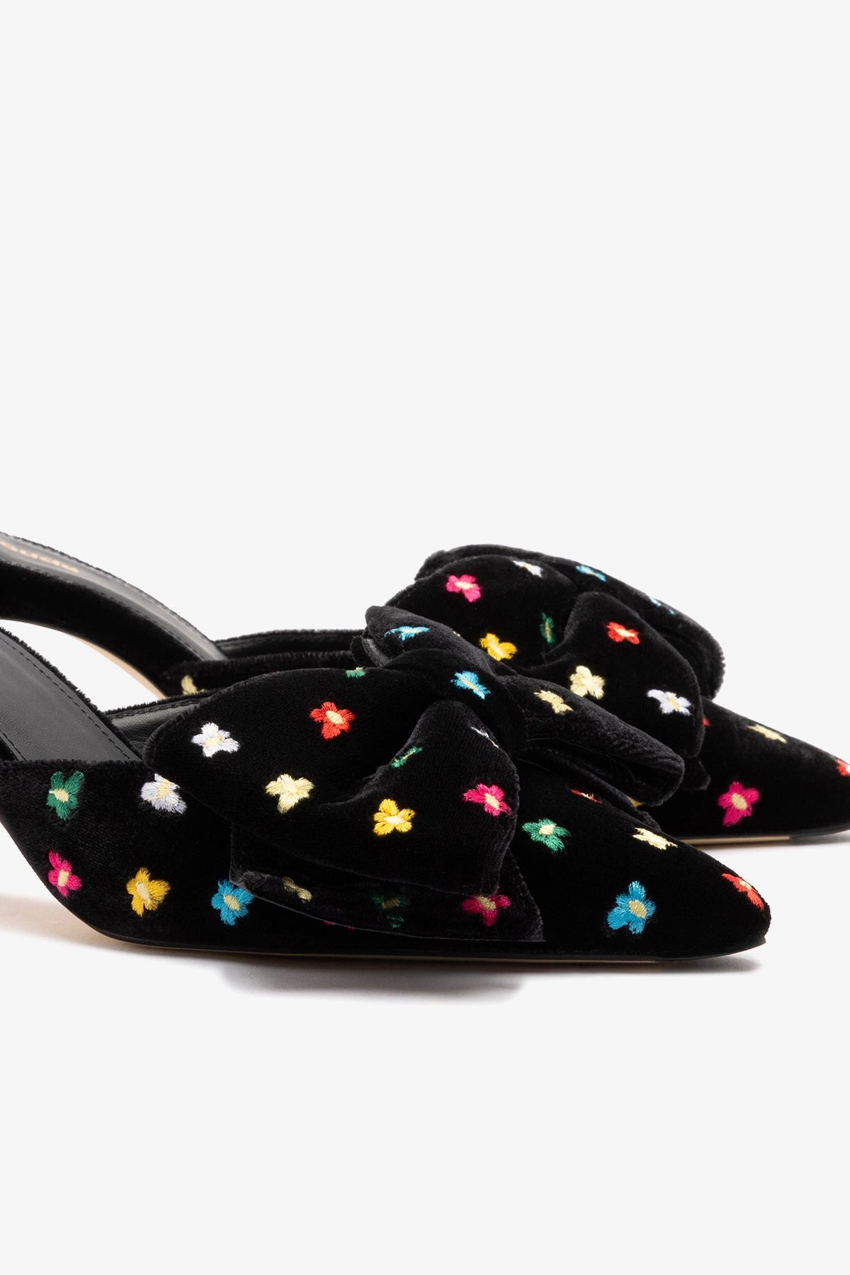 Our iconic Mini Elle pump is back, this time in plush black velvet with embroidered rainbow florals that make every step a little brighter. A mix of festive charm and couture craftsmanship, she’s the kind of shoe that turns even a simple outfit into a moment.