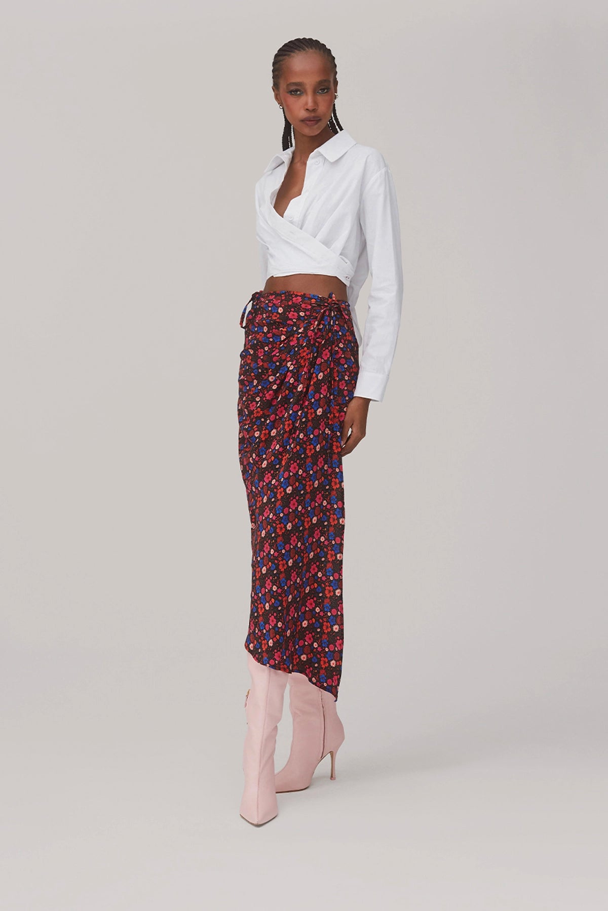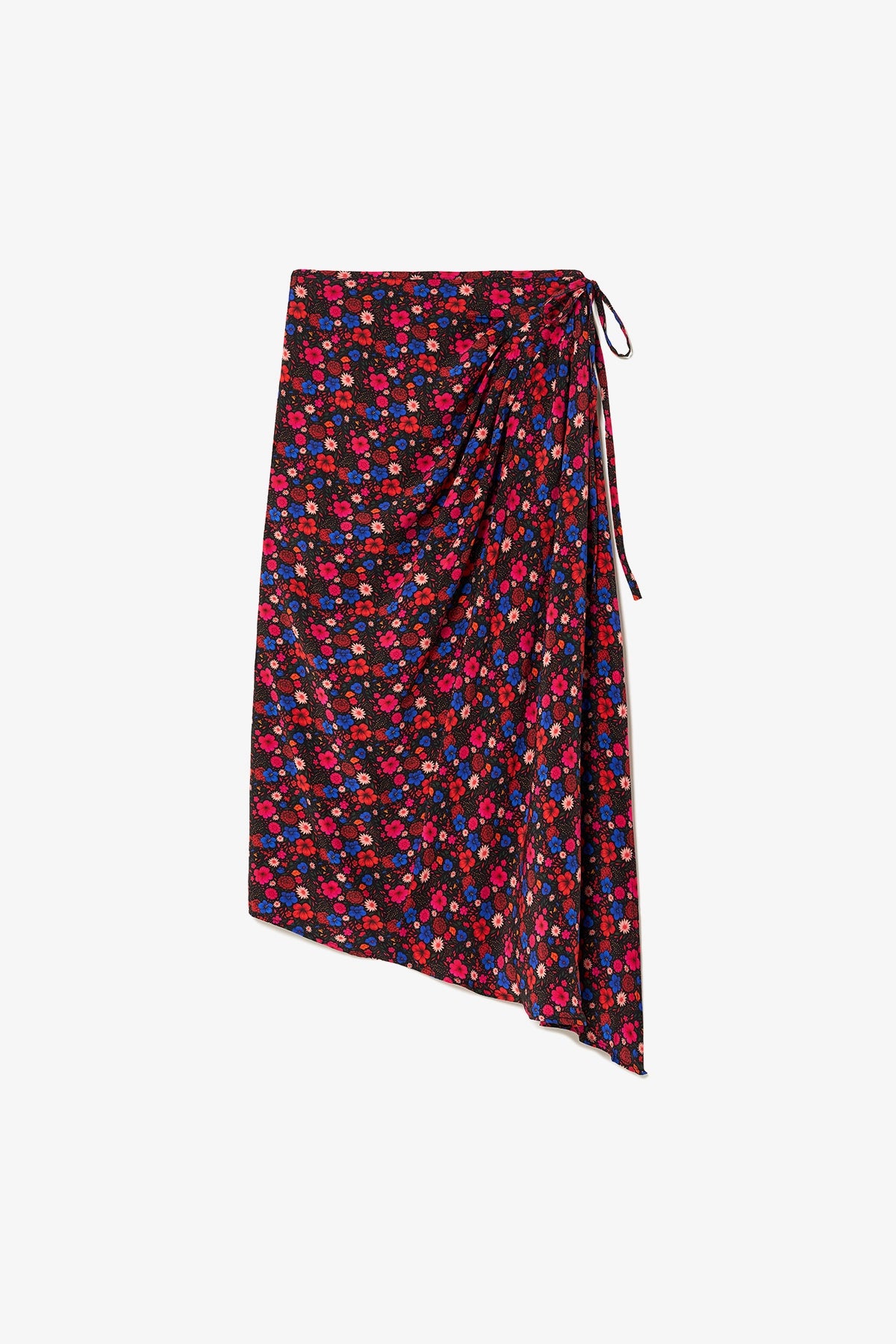Pleated wrap skirt in black floral silk, designed with a lightweight feel and fluid movement. The wrap silhouette offers an adjustable fit, creating an effortless and comfortable shape for day or night.