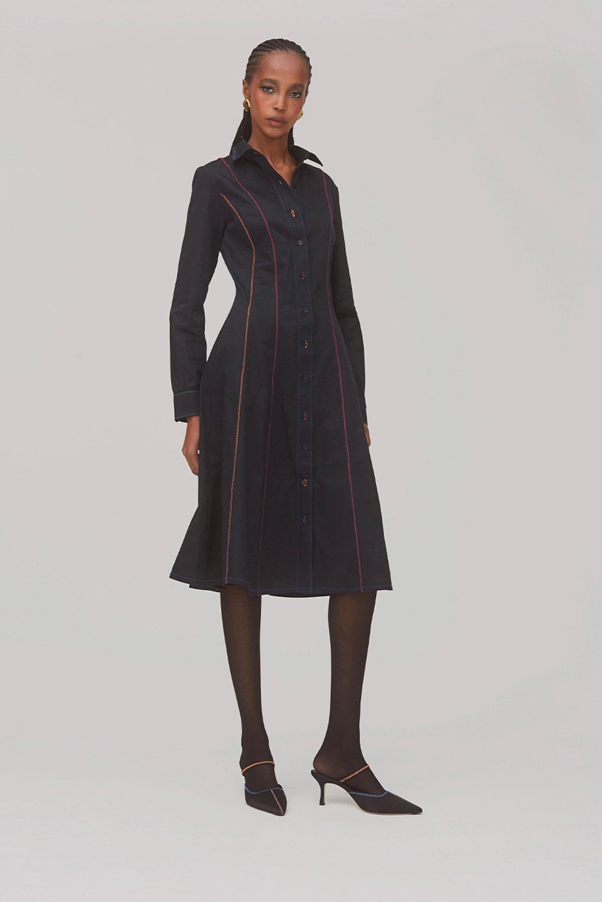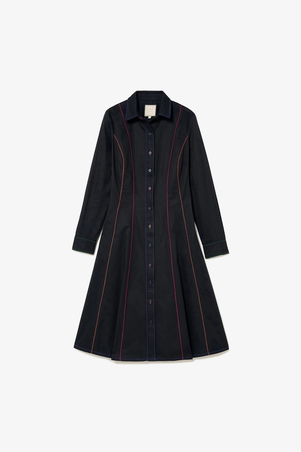 Button-down dress in black percale, designed with a lightweight feel and a clean, structured silhouette. The below-the-knee length adds balance and versatility, making it an easy piece for everyday wear.