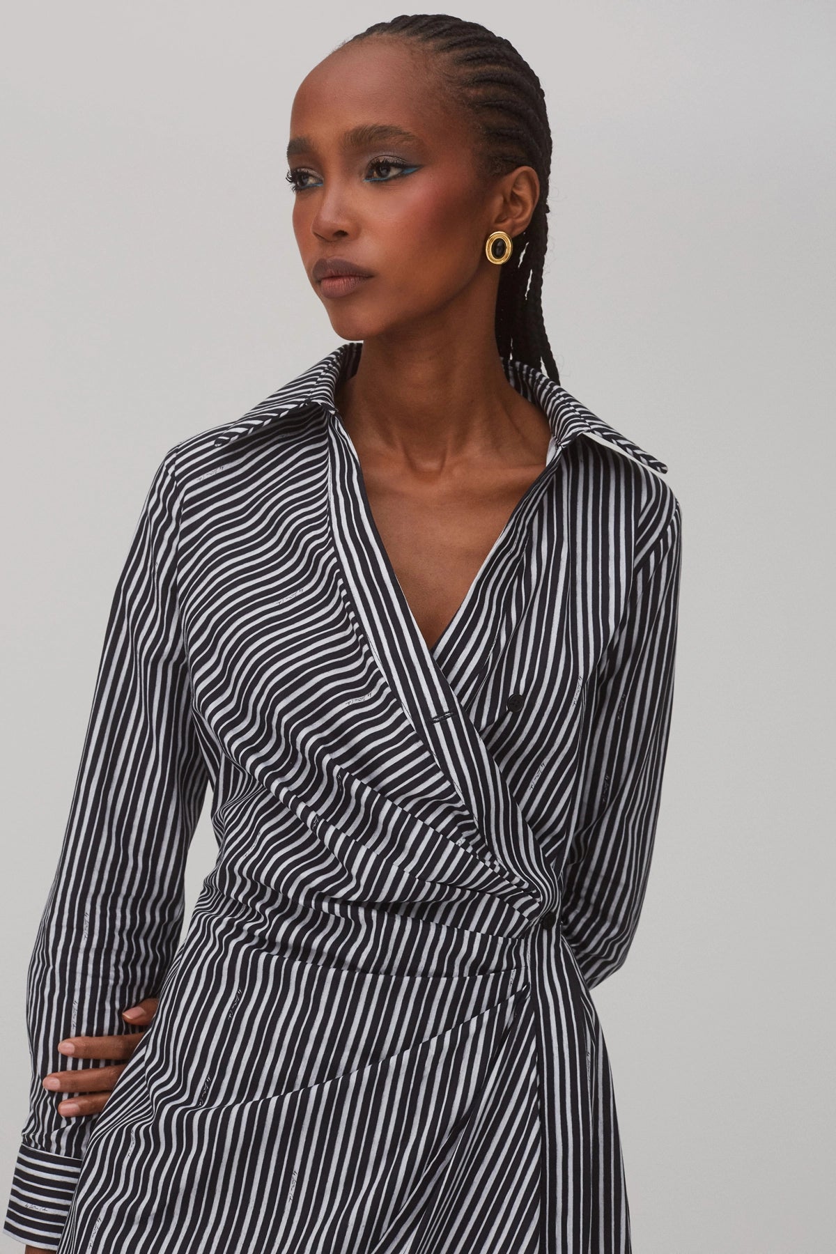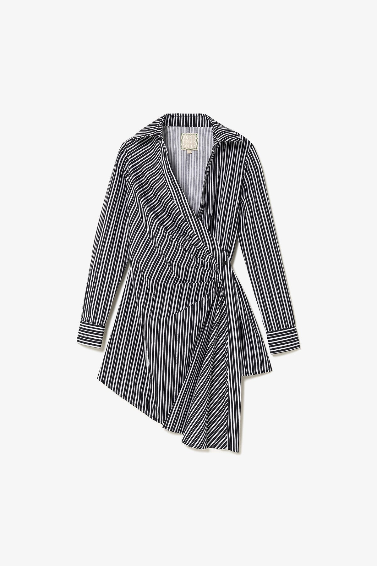 Short wrap dress in black and white striped cotton, designed with a lightweight feel and an adjustable fit. The wrap silhouette naturally flatters the body, offering comfort and versatility from day to night.