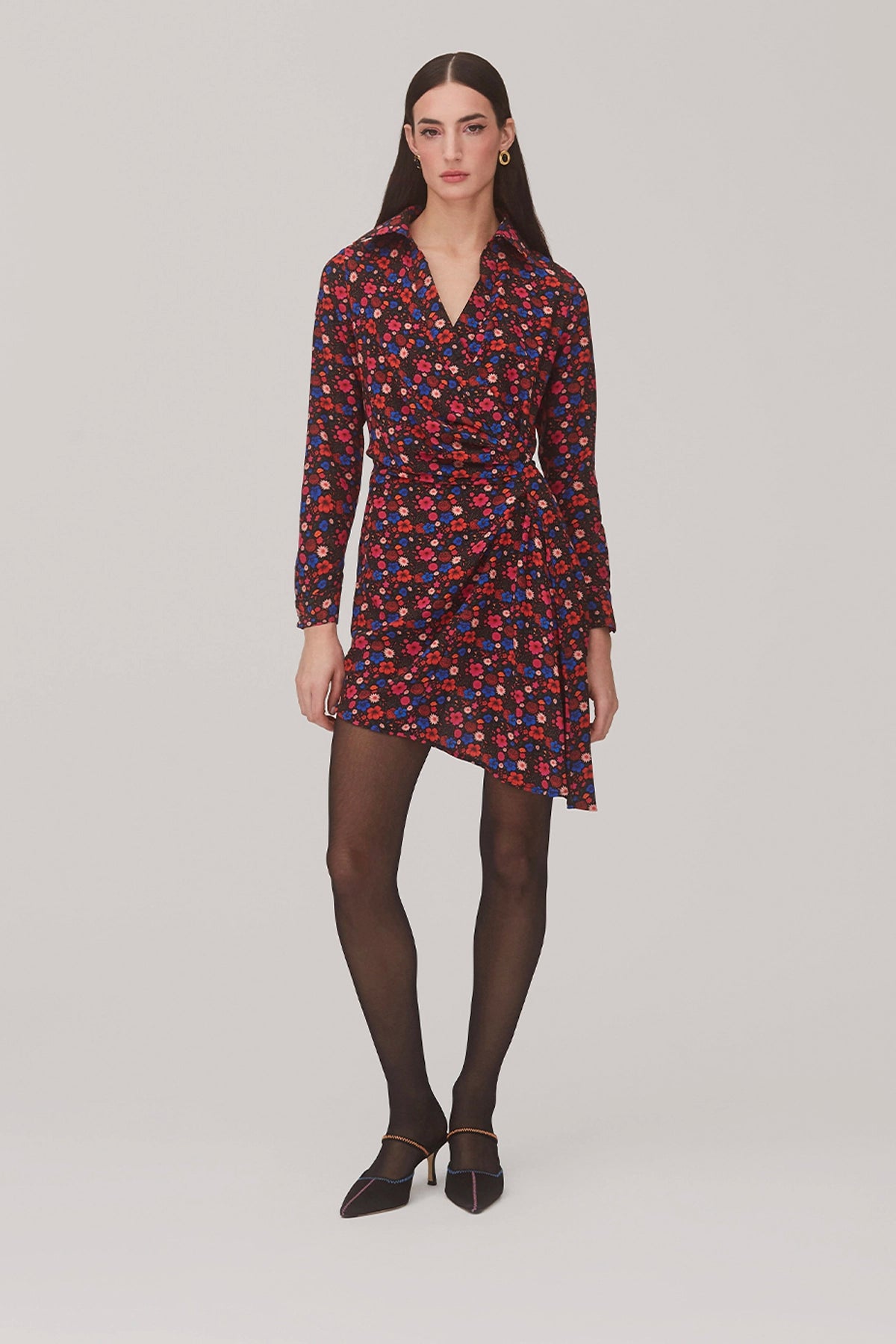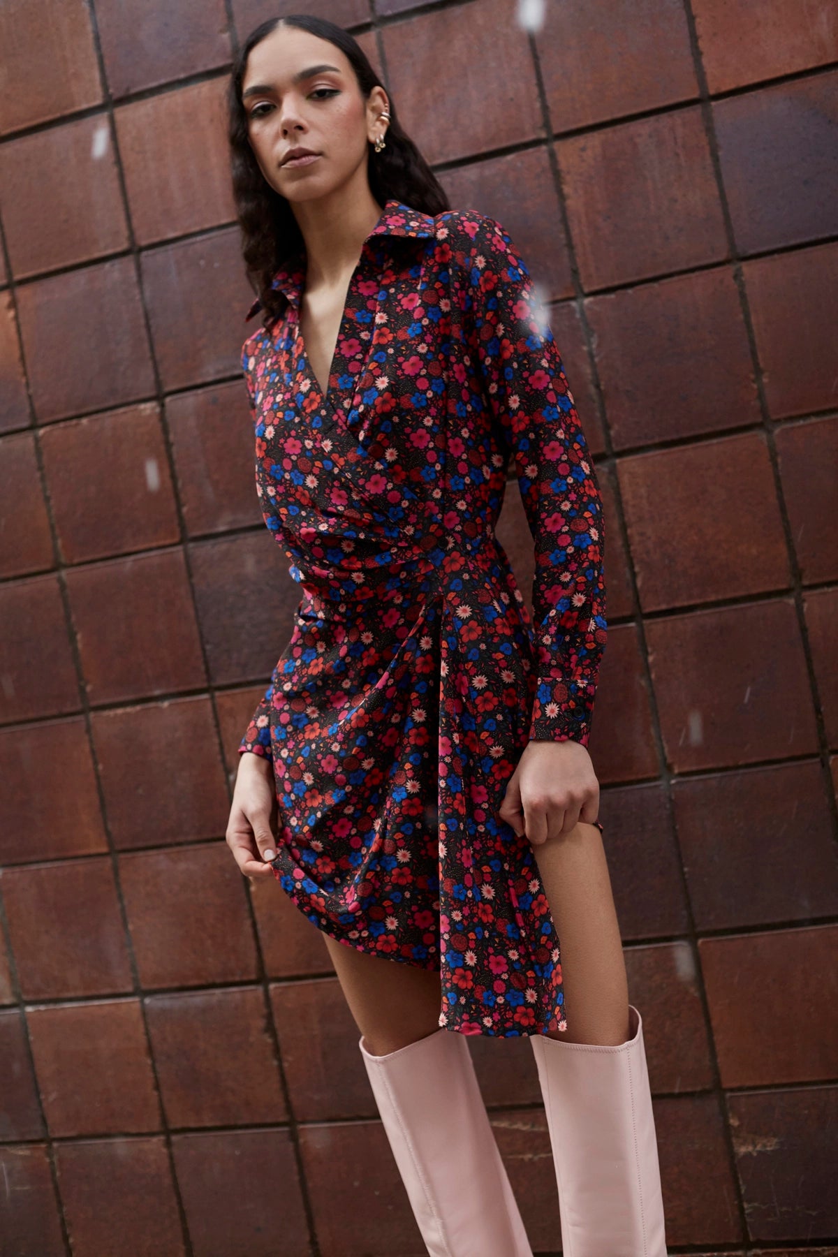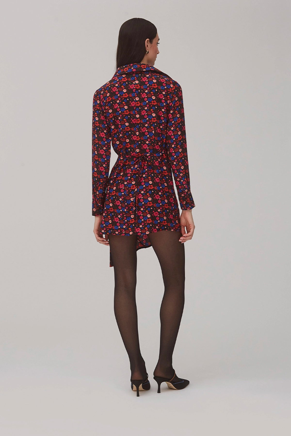 Short wrap dress in black floral silk, designed with a lightweight feel and an adjustable fit. The wrap silhouette naturally flatters the body, offering comfort and versatility from day to night.