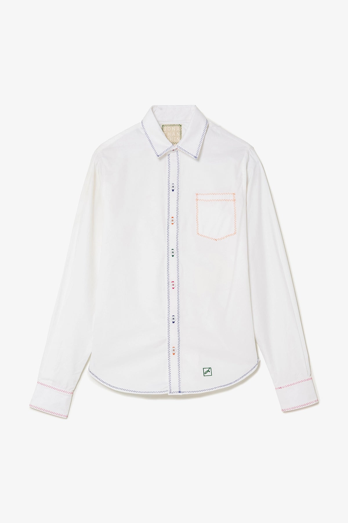 Button-down shirt in white percale, designed with a lightweight feel and a clean, classic silhouette. The front button closure adds timeless appeal, while the colorful zig-zag stitches gives a joyful accent.