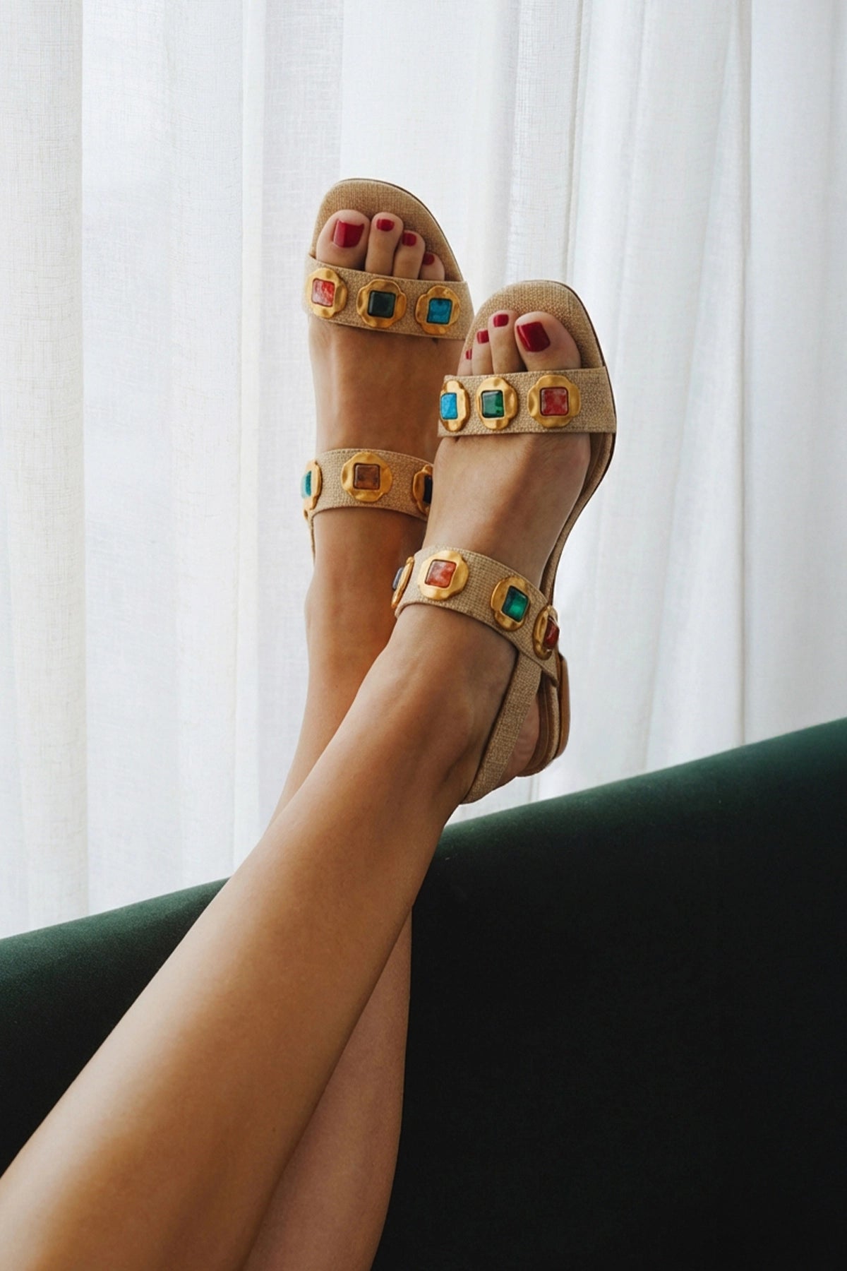 The Milan Gioiello flat blends a striking silhouette with artisan-inspired details that stand out naturally. Crafted in soft raffia, it features gold-toned accents set with colorful stones, creating a vibrant, eye-catching look.