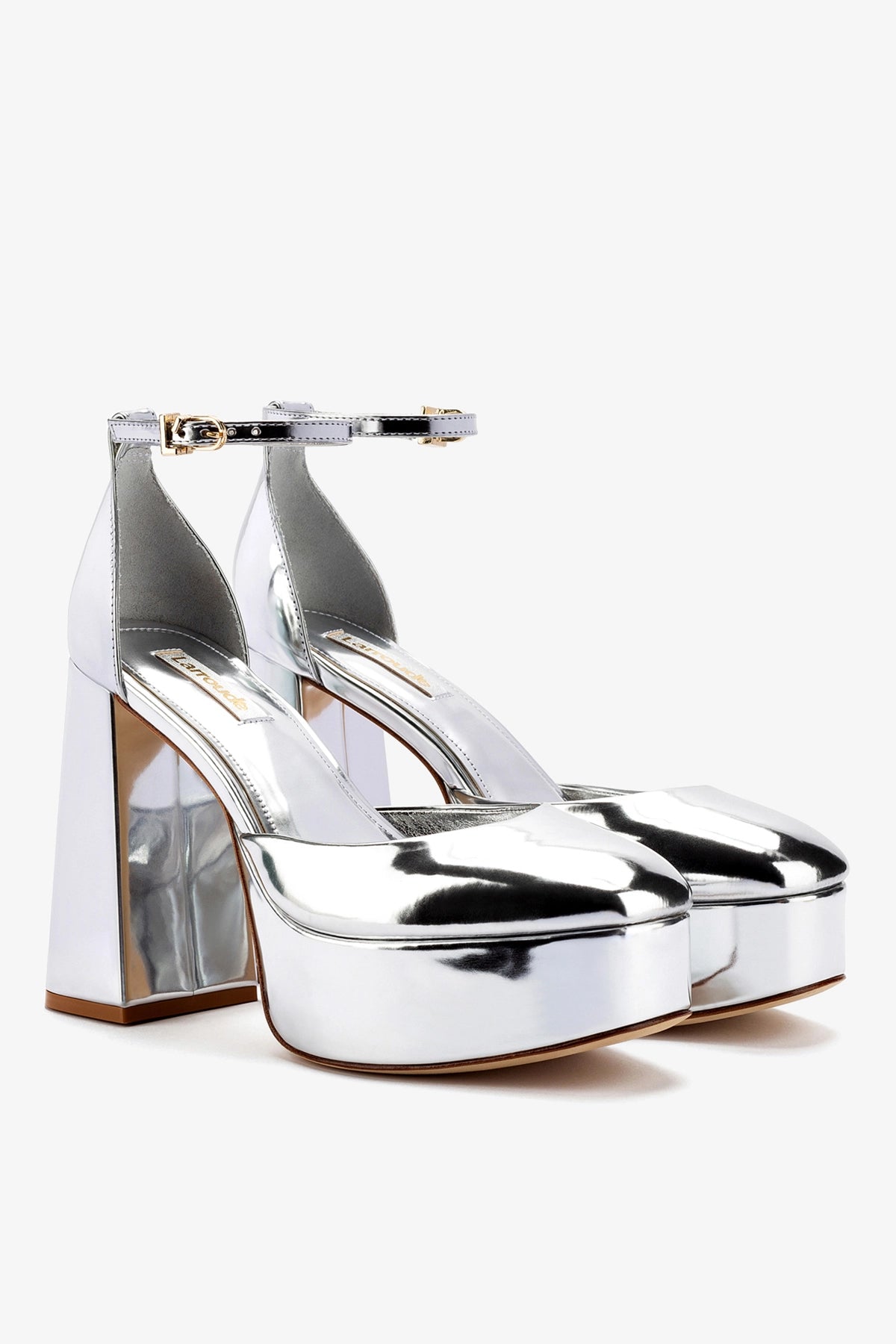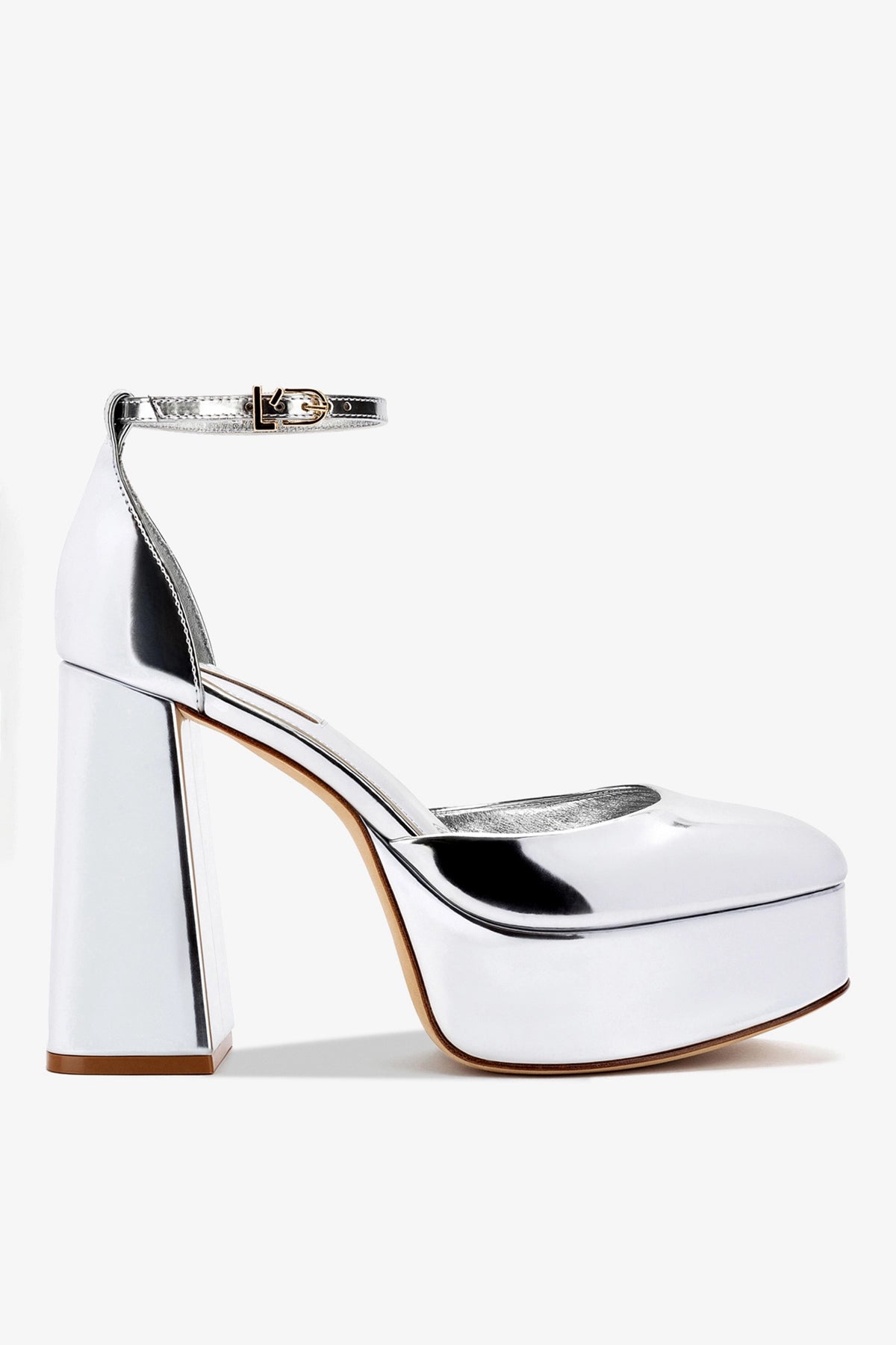 Known for the comfort of our heels, we couldn't help but add another sky-high platform to our collection. The Ari mixes the shape of our Dolly with a covered toe and functional ankle strap, in a mirrored silver metallic that literally goes with everything.