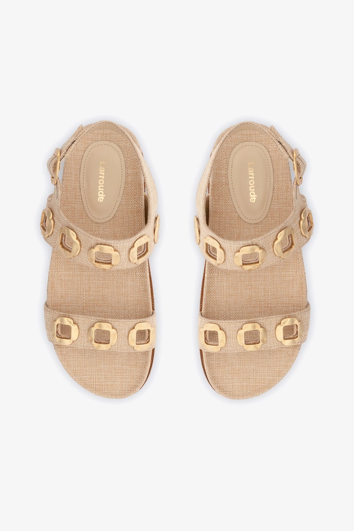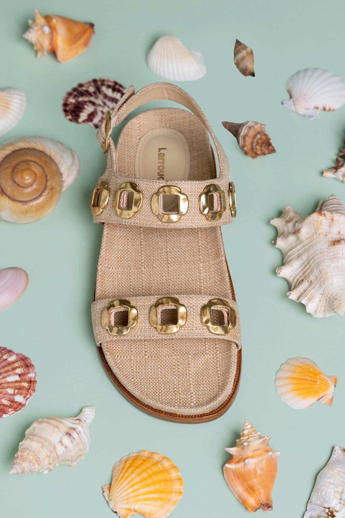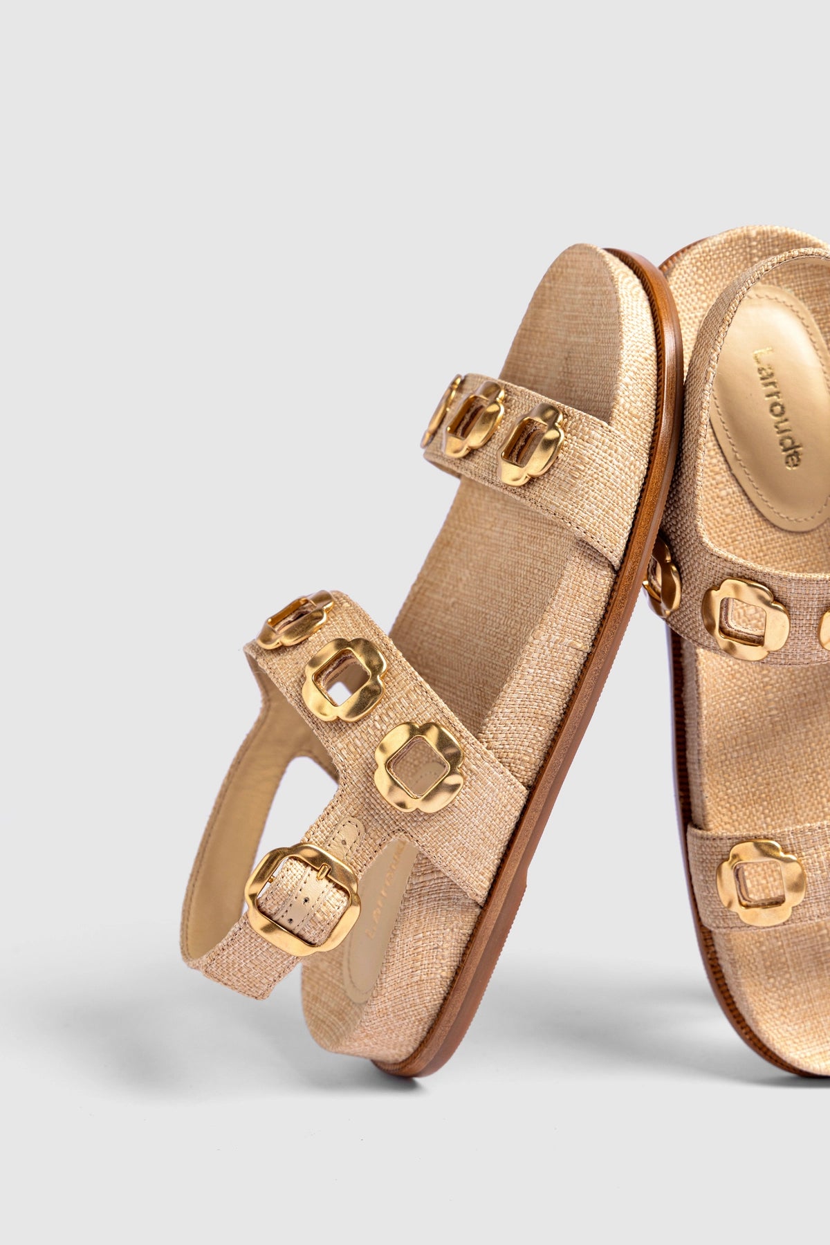 A new take on the Milan collection, the Milan Sporty brings the signature gold hardware to an easy, everyday sandal. Crafted in soft raffia with a supportive, molded footbed, it delivers the polished look you love with the comfort you want for long days on the go. The wide straps and adjustable buckle ensure a secure fit, while the low platform adds subtle lift without compromising ease.
