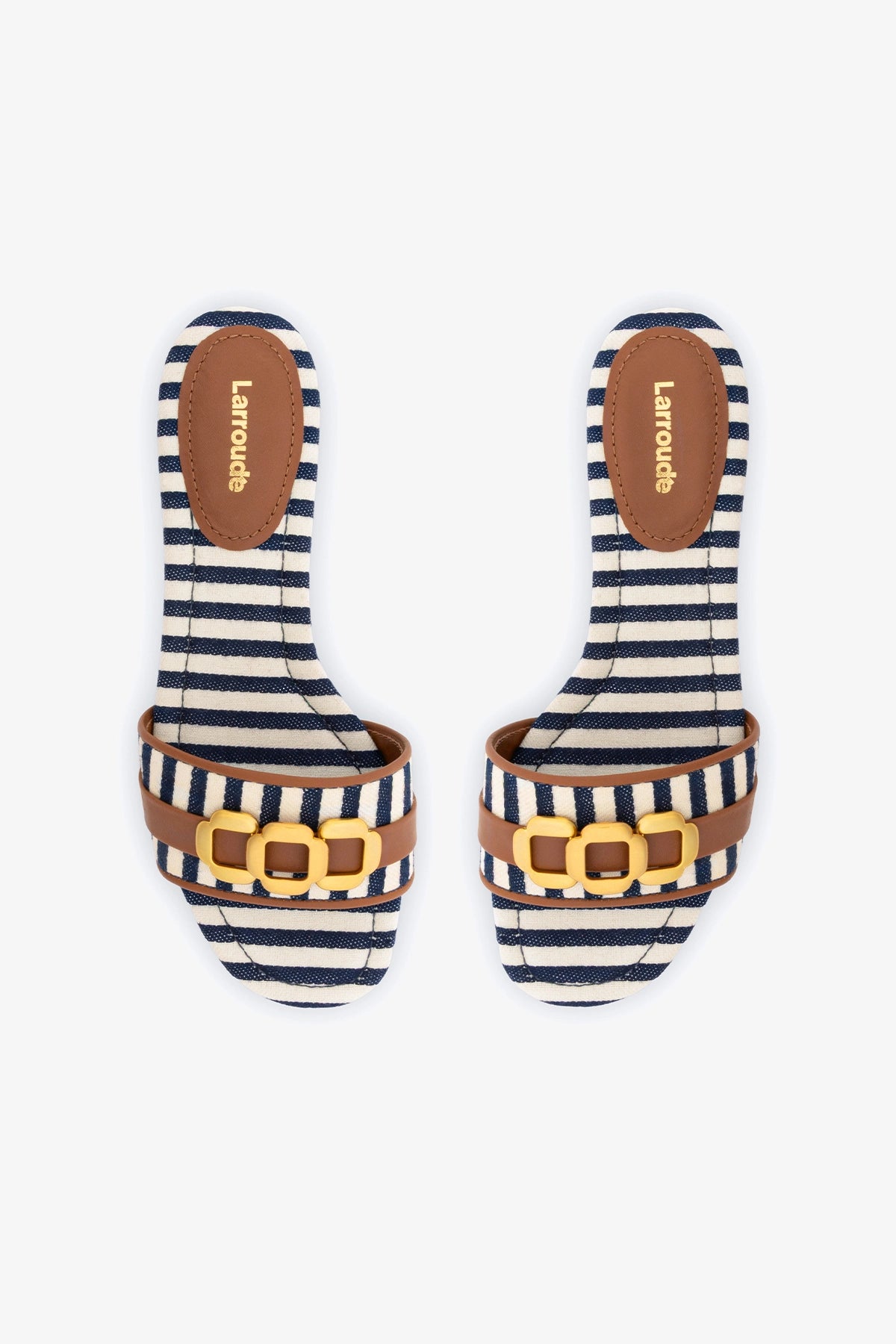 A minimalist slide that blends natural texture with a polished finish. The front strap combines soft leather with striped awning, highlighted by our signature hardware in gold metal. The result is a light, fresh look with plenty of personality.