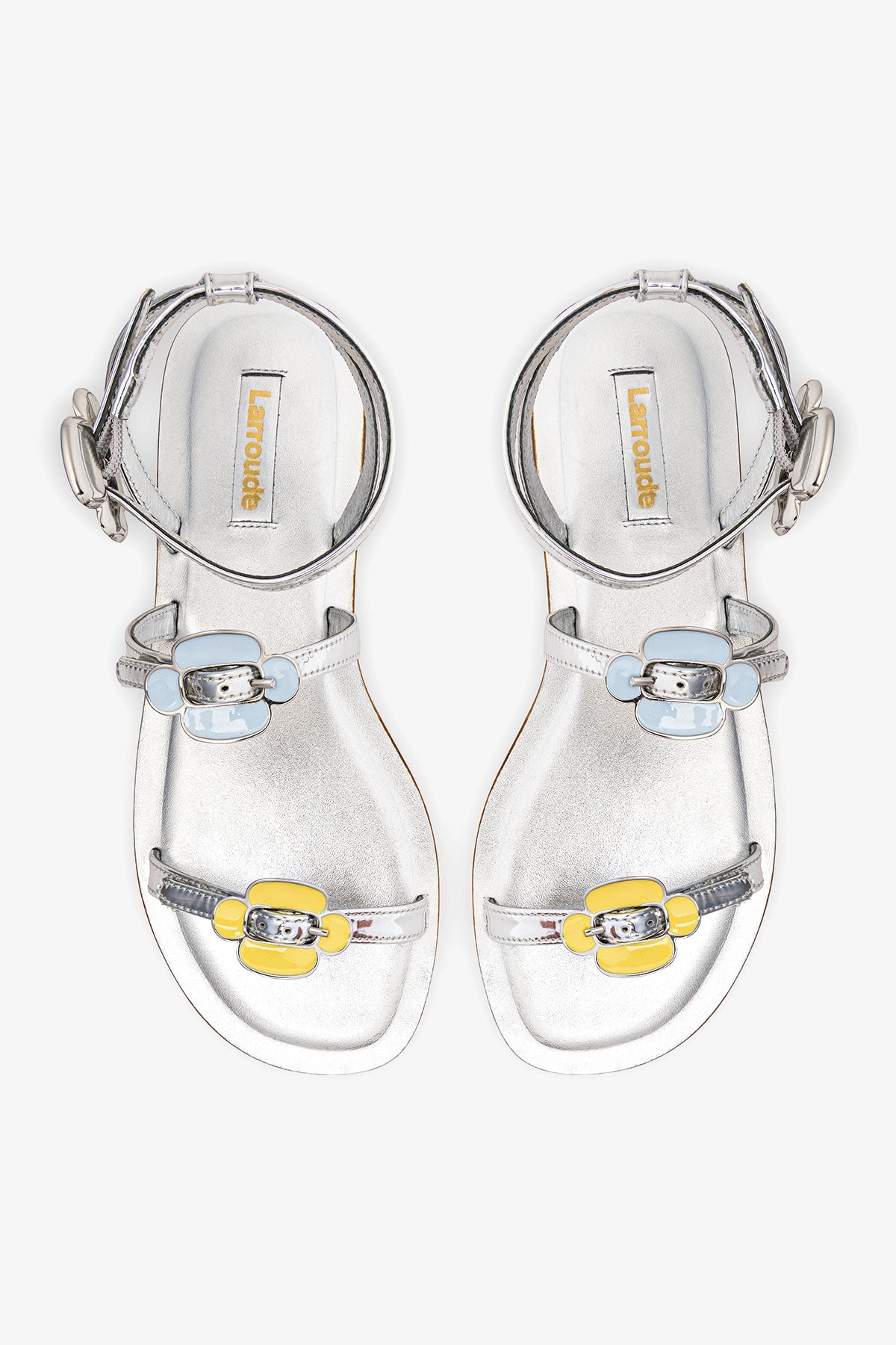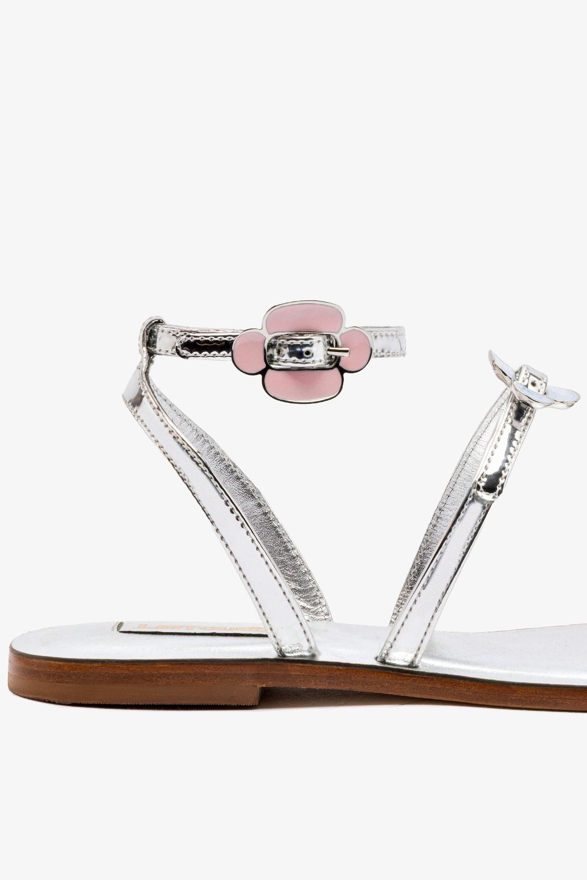 The Tinx is a dose of art and color for your closet, proving that style doesn't need a heel. Crafted in silver specchio, the thin straps are highlighted by primary color accents and small floral buckles, injecting a graphic, playful touch into this essential flat sandal.
