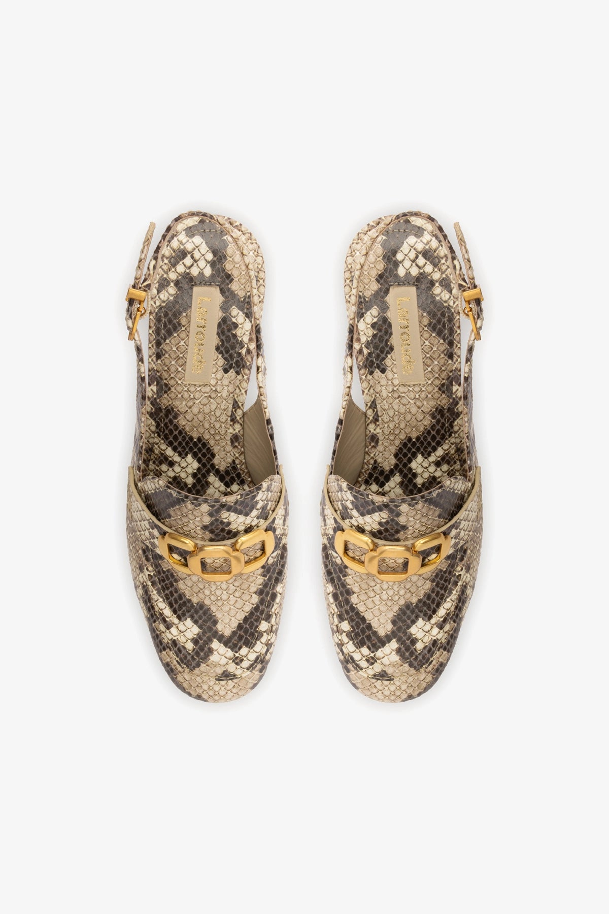Harrington Low is the new take on our best-selling slingback, now in a lower heel with the same powerful platform. Crafted from snake leather and with the signature golden buckle, it brings a sturdy, impactful look.