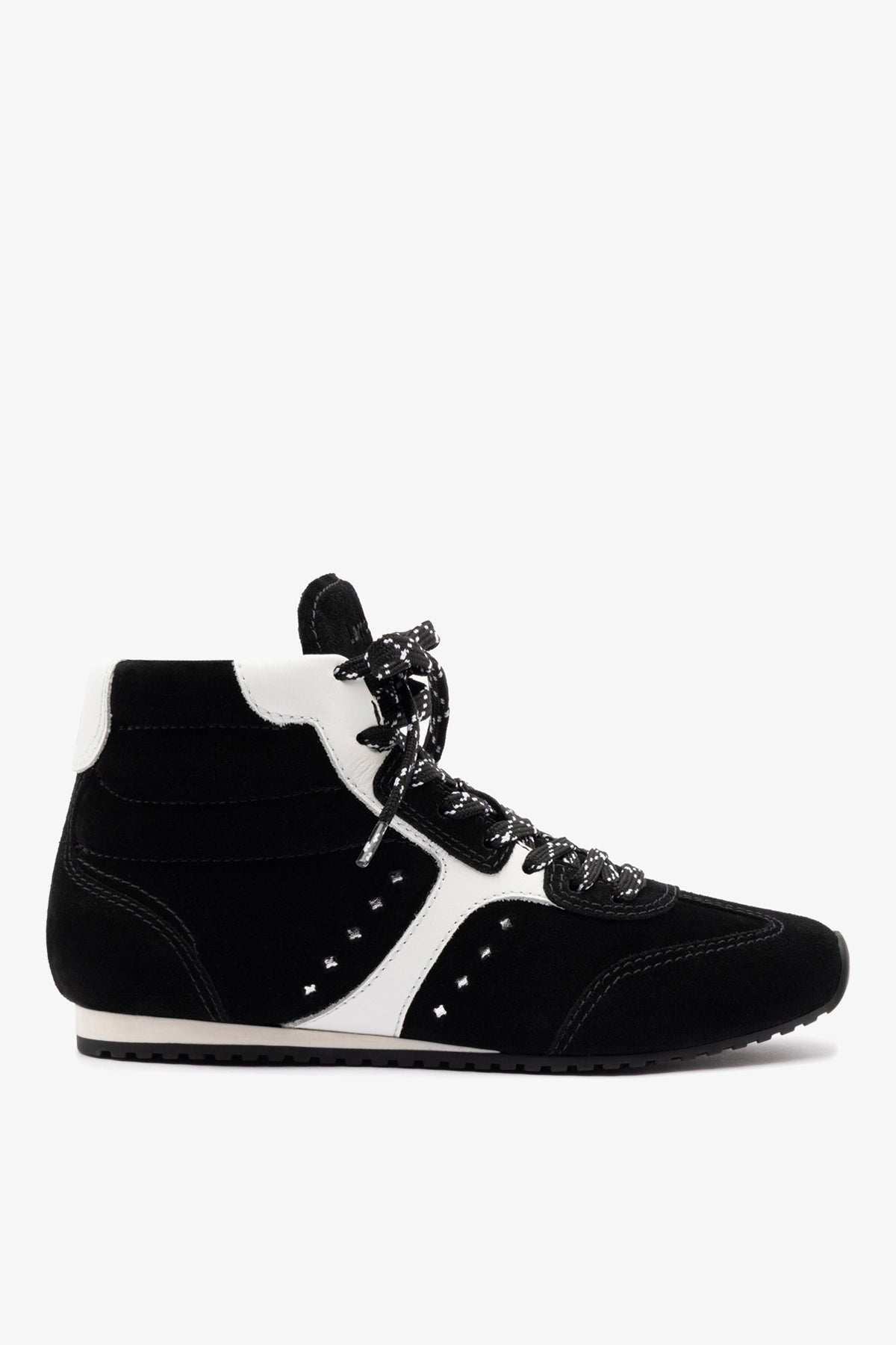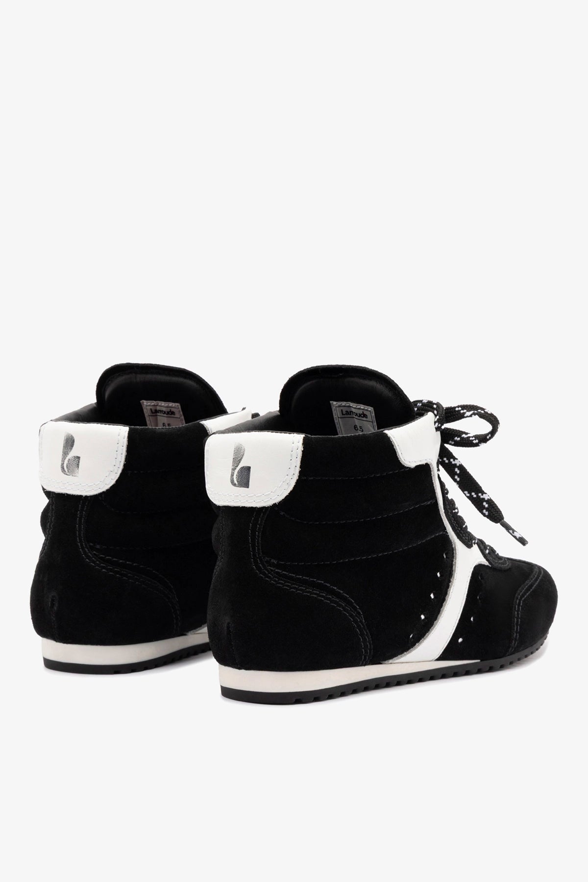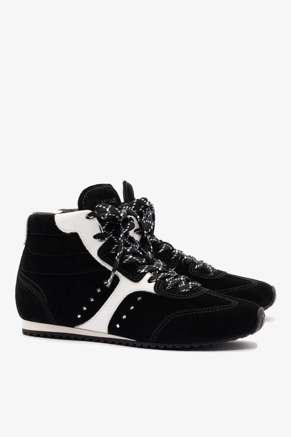 We're in our athletic era. The very first sneaker by Larroudé, the Stella blends functionality and form with fashion. Now in an abbreviated high top, this new shoe comes in a classic black suede that you can wear with anything from day dresses and denim to workout gear at the gym.