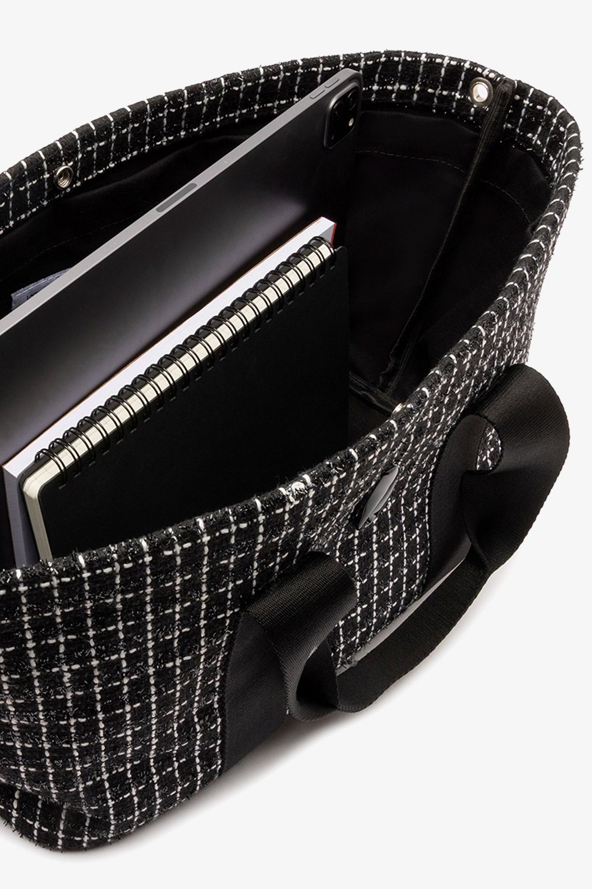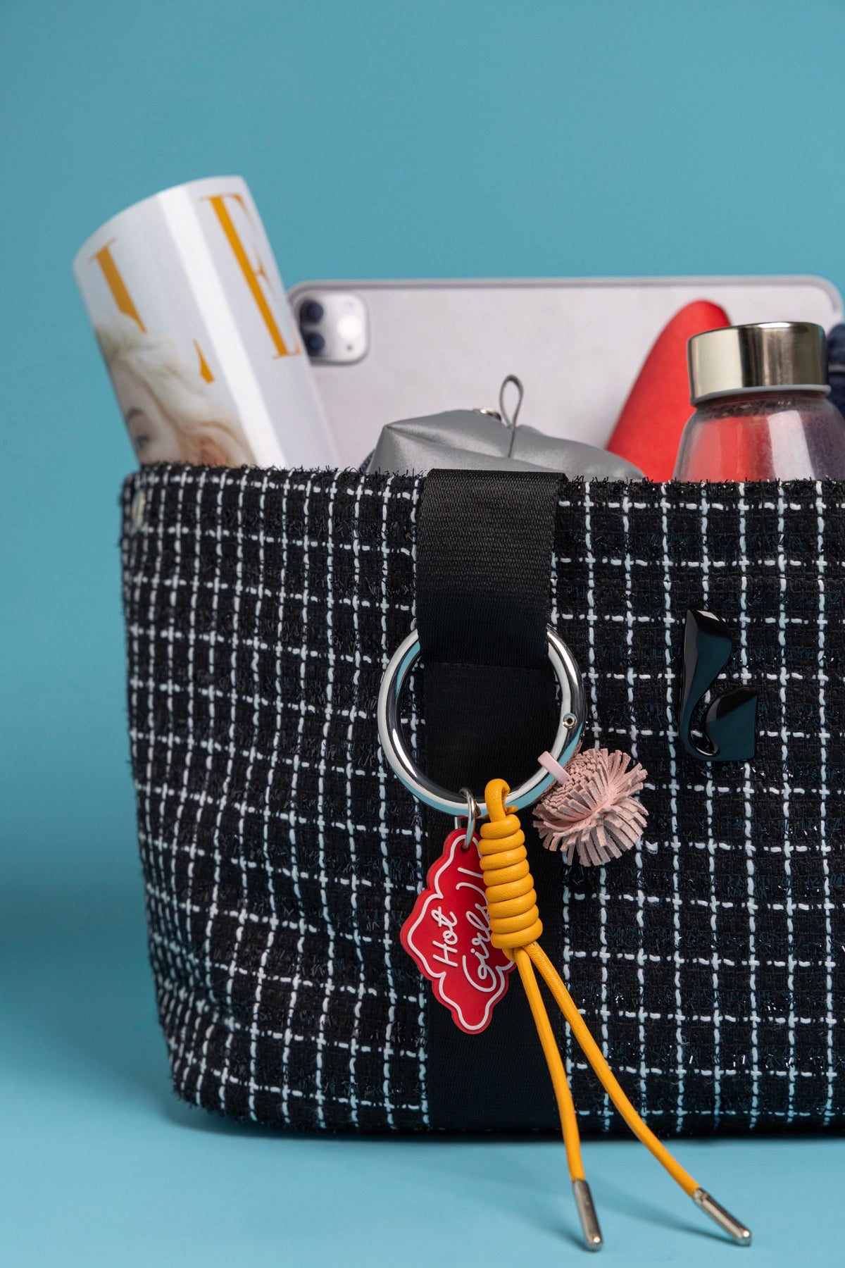 The Americana Tote brings a cool, laid-back feel to everyday style. Crafted in a super fashion-forward tweed with sporty straps and a statement key-ring charm, it blends practicality with a modern edge. Spacious, lightweight, and built for real life, it fits your daily essentials, and then some—making it the ultimate carry-all for city days, airport runs, and weekend plans.