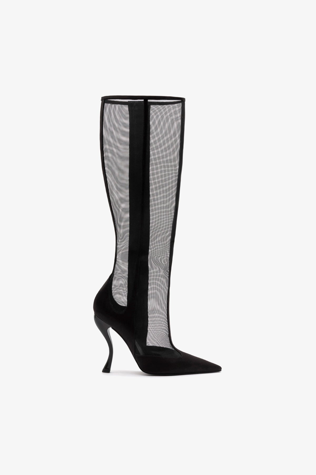 The architectural lines of young Italian designer Nicoló Beretta meet the creativity of Larroudé in an exclusive collaboration. The Zuzu is the perfect fusion of the timeless elegance of black satin and the sensuality of transparent mesh. The tall shaft hugs the leg like a second skin, while the pointed toe and sculptural heel complete the powerful and dramatic silhouette.