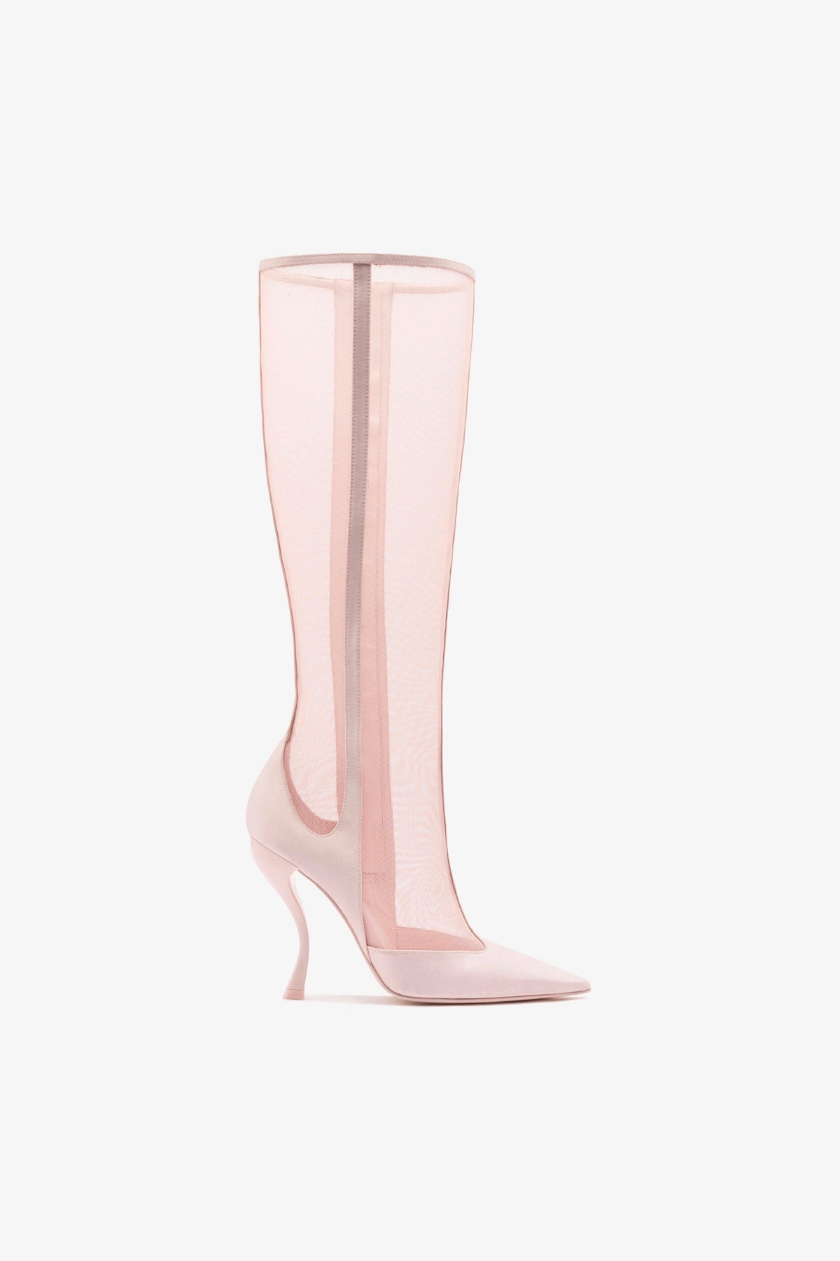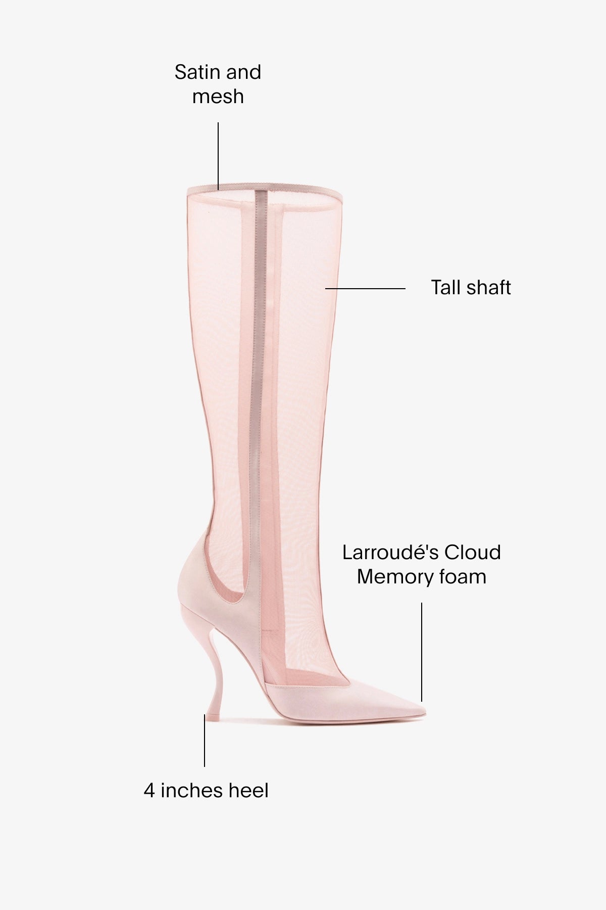 The architectural lines of young Italian designer Nicoló Beretta meet the creativity of Larroudé in an exclusive collaboration. The Zuzu is the perfect fusion of the timeless elegance of black satin and the sensuality of transparent mesh. The tall shaft hugs the leg like a second skin, while the pointed toe and sculptural heel complete the powerful and dramatic silhouette.