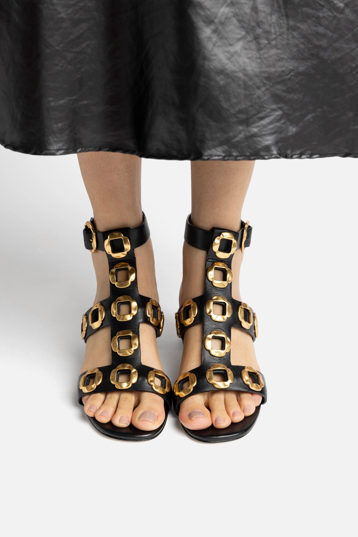 The Milan Gladiator Block blends a bold gladiator-inspired silhouette with a modern, polished finish. Crafted from soft leather and punctuated with the signature gold buckles, it brings structure, presence, and comfort thanks to the supportive block heel.