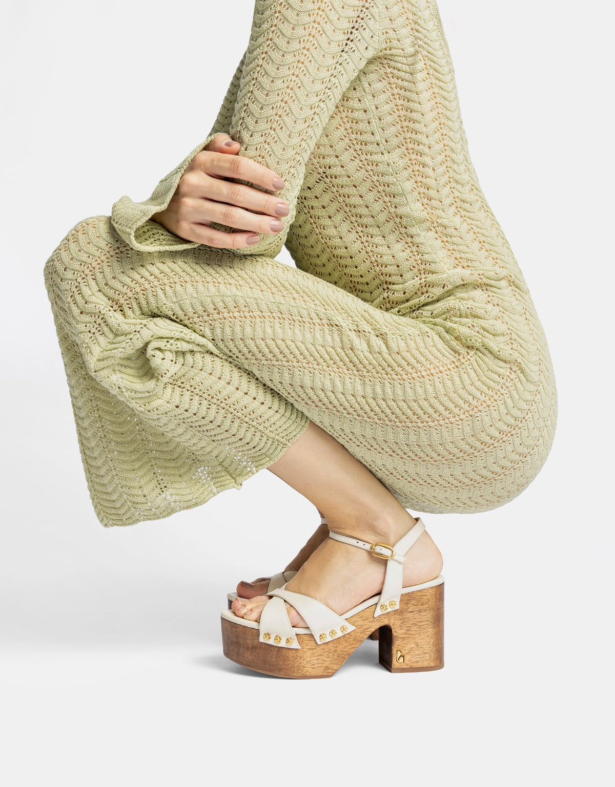 Meet the Talitha—a clog-inspired platform with a retro attitude and modern comfort. It features crisscross leather straps, studded detailing, and a wood-look heel that adds height with stability.