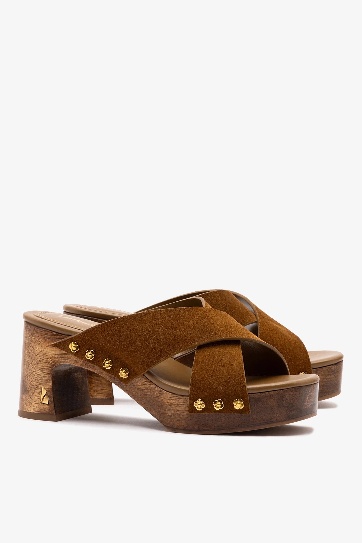 The vintage charm of the 70scomes alive in the Talitha Dolly Mule. Wide straps in plush suede sit atop a sturdy, wooden block heel, providing both height and stability. The gold floral appliqués add an unexpected touch to this powerful silhouette.