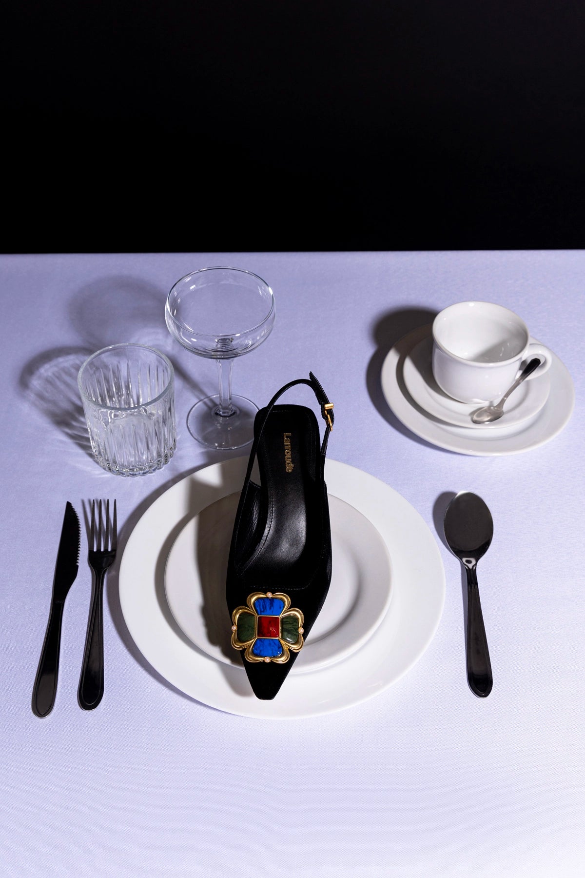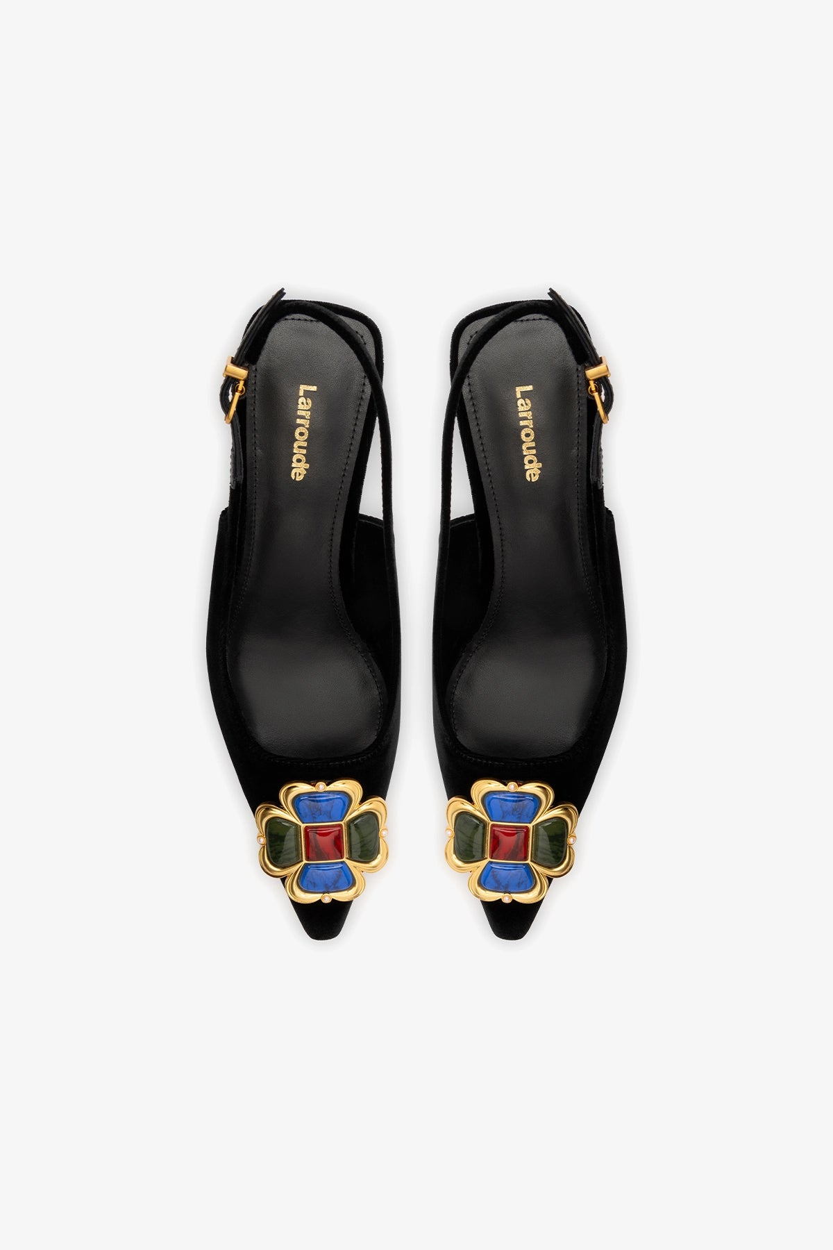 Meet the Chrissy, our newest kitten heel pump inspired by the exuberant 80s couture of Christian Lacroix—think rich textures, bold details, and unapologetic glamour. Crafted in plush velvet and finished with a sculptural ornament, it’s made to steal the spotlight (and maybe a few hearts along the way).