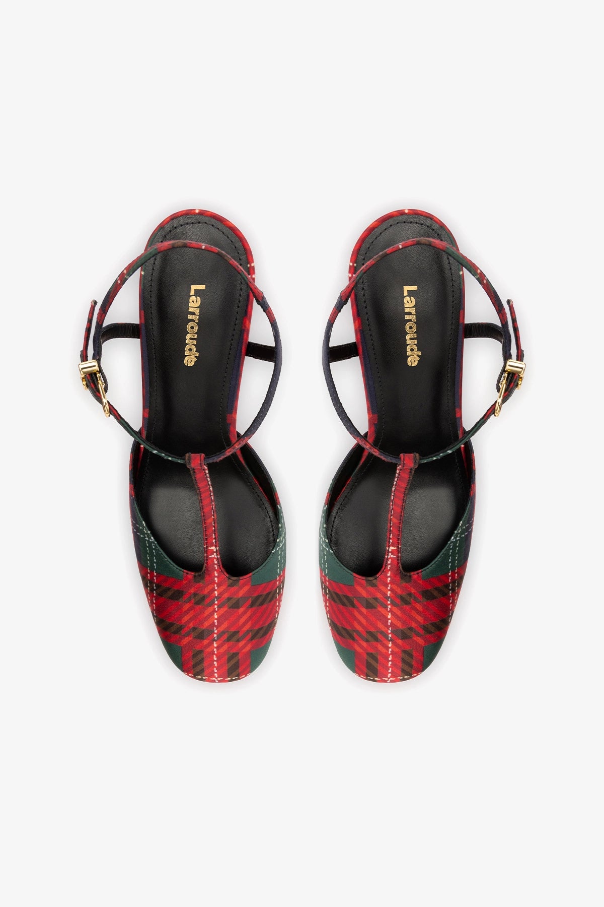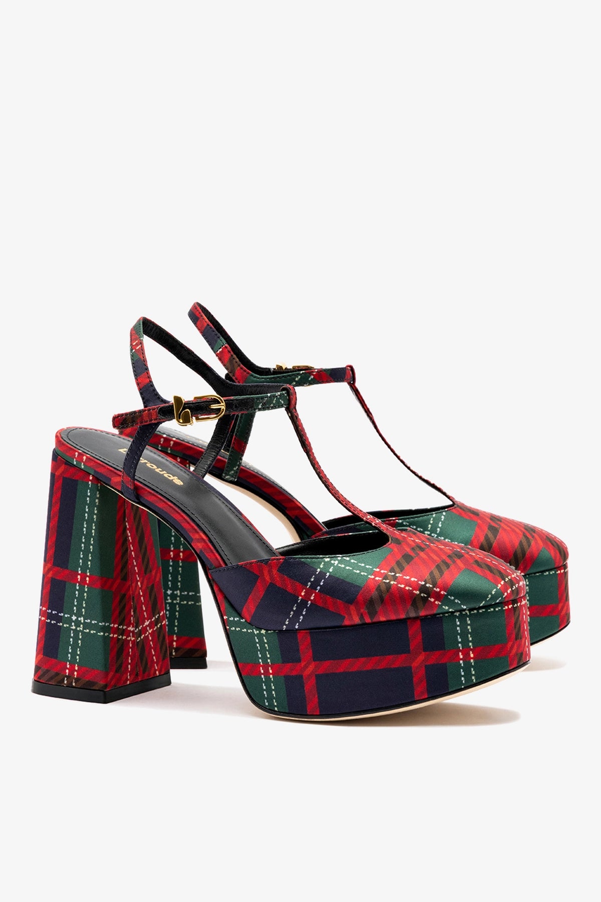 The Pixie pump is reimagined in vibrant and luxurious tartan satin—an instant statement that's as timeless as it is unexpected. With its T-strap platform silhouette and sky-high block heel, it defines bold festive spirit, made to take you from warm family celebrations to the night's hottest parties.