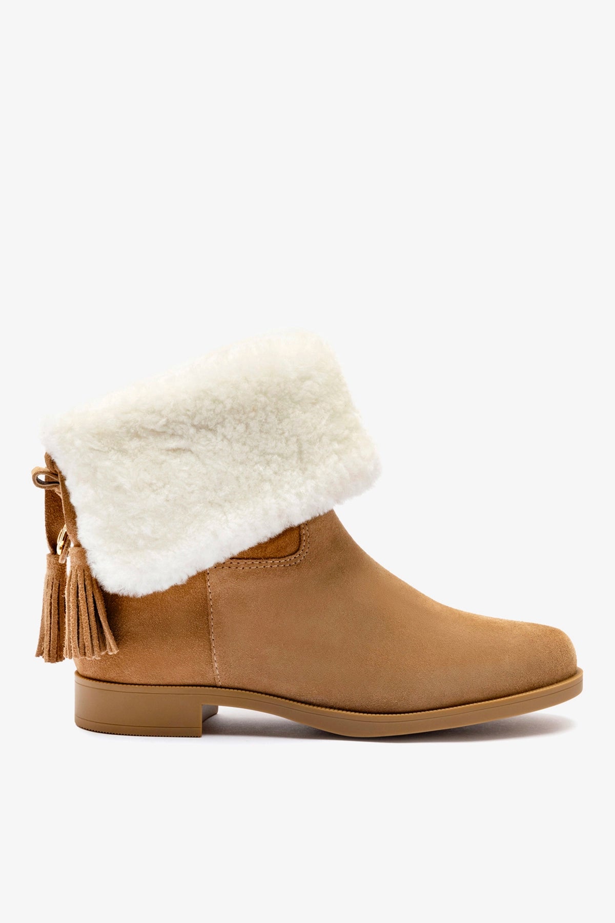 Inspired by alpine escapes, the Verbier boot blends cozy textures and understated elegance. Made from soft caramel suede with exposed natural shearling lining, it's the ultimate cold-weather companion — warm, stylish, and endlessly versatile. The folded short shaft and tassel detail bring movement and charm, making it perfect for pairing with winter denim, chunky knits, or sweater dresses and tights.
