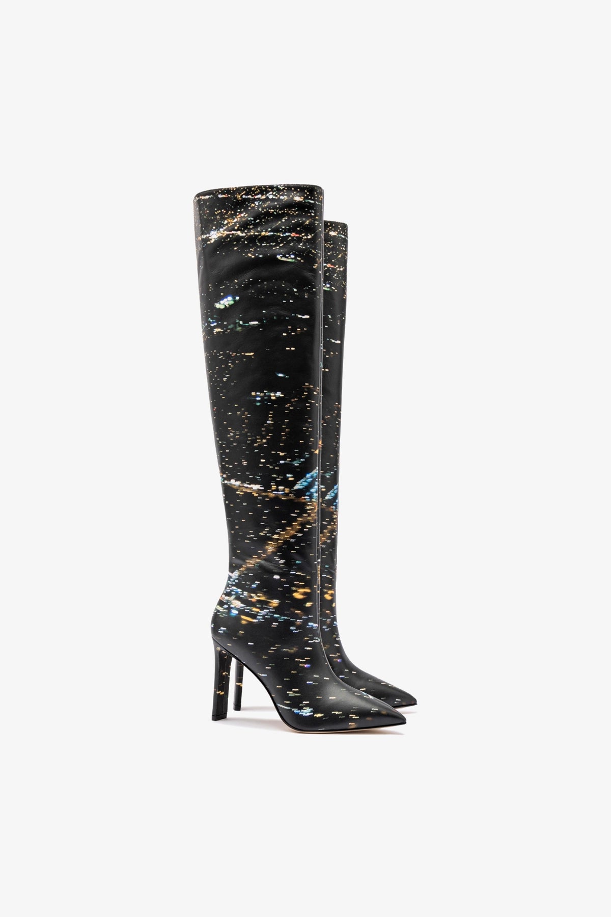 Reflective of L.A.'s city skyline, this napa leather print sky-high boot perfectly embodies the spirit of Libertine, bringing designer Johnson Hartig's punk rock edge and couture sensibility to a signature Larroudé silhouette.