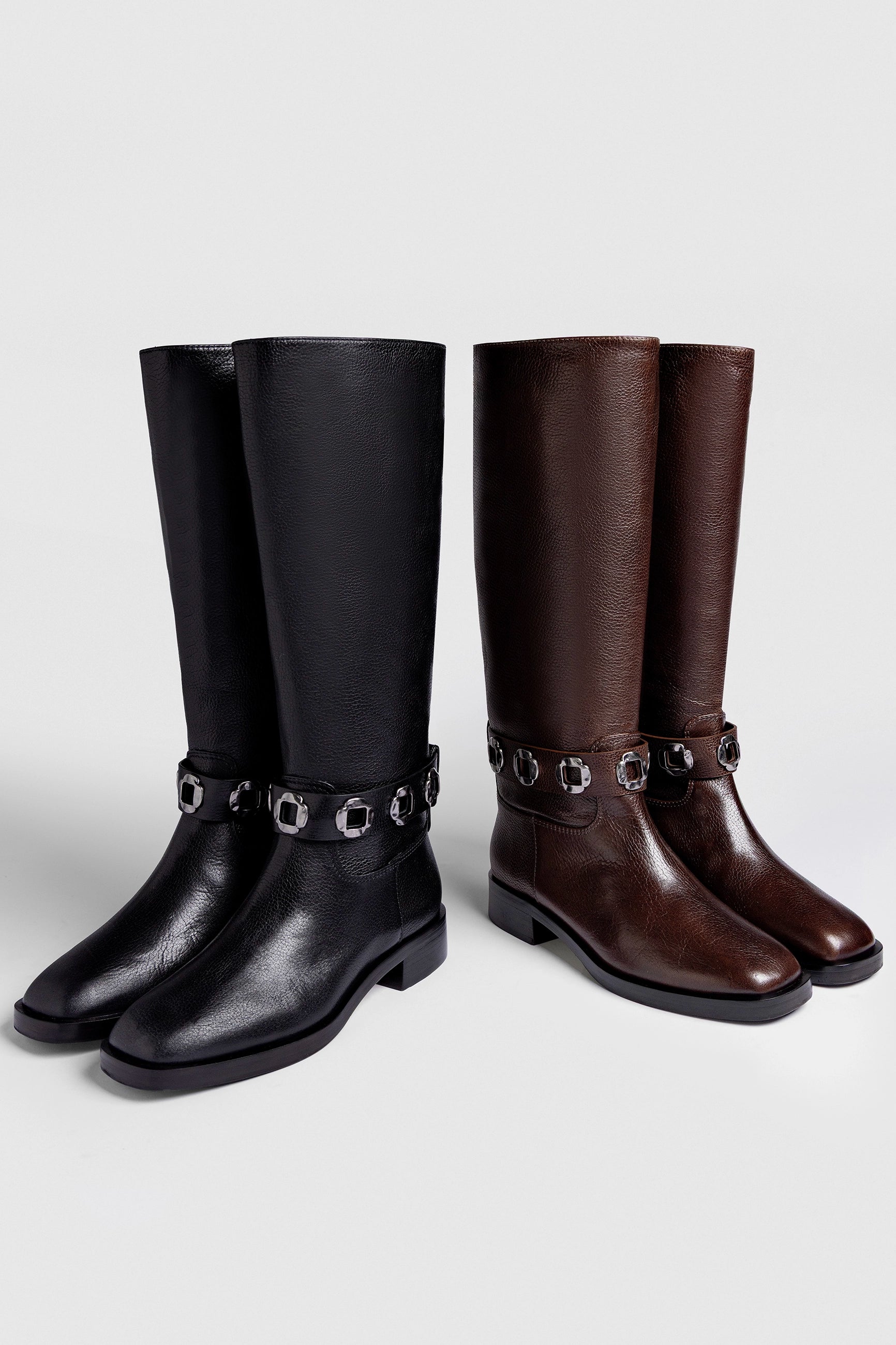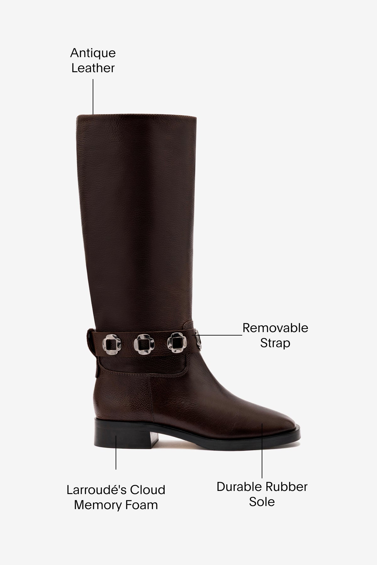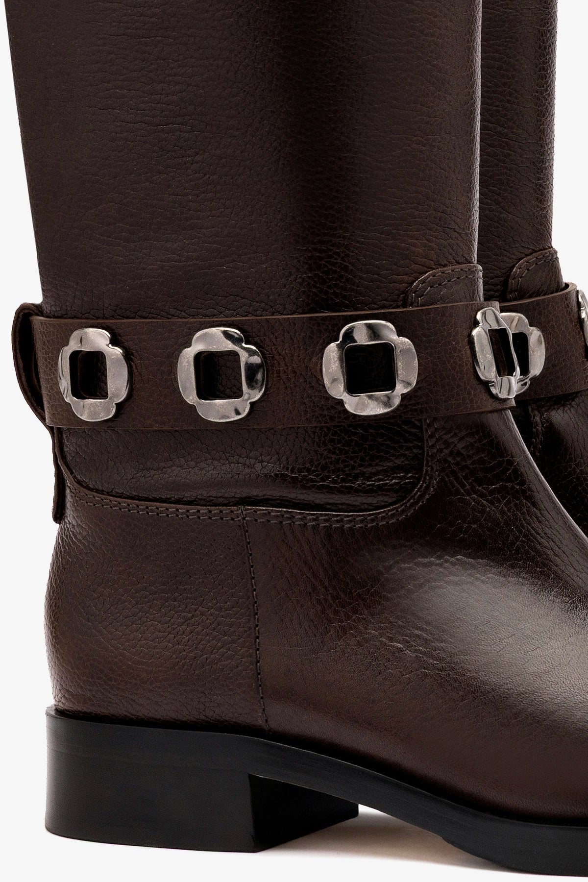 The Milan Boot is a classic that reinvents itself, with a tall shaft and a flat design that ensures total comfort. The detail that transforms it is the removable strap with the signature Daisy buckles, adding a cool and unexpected touch to this timeless silhouette.