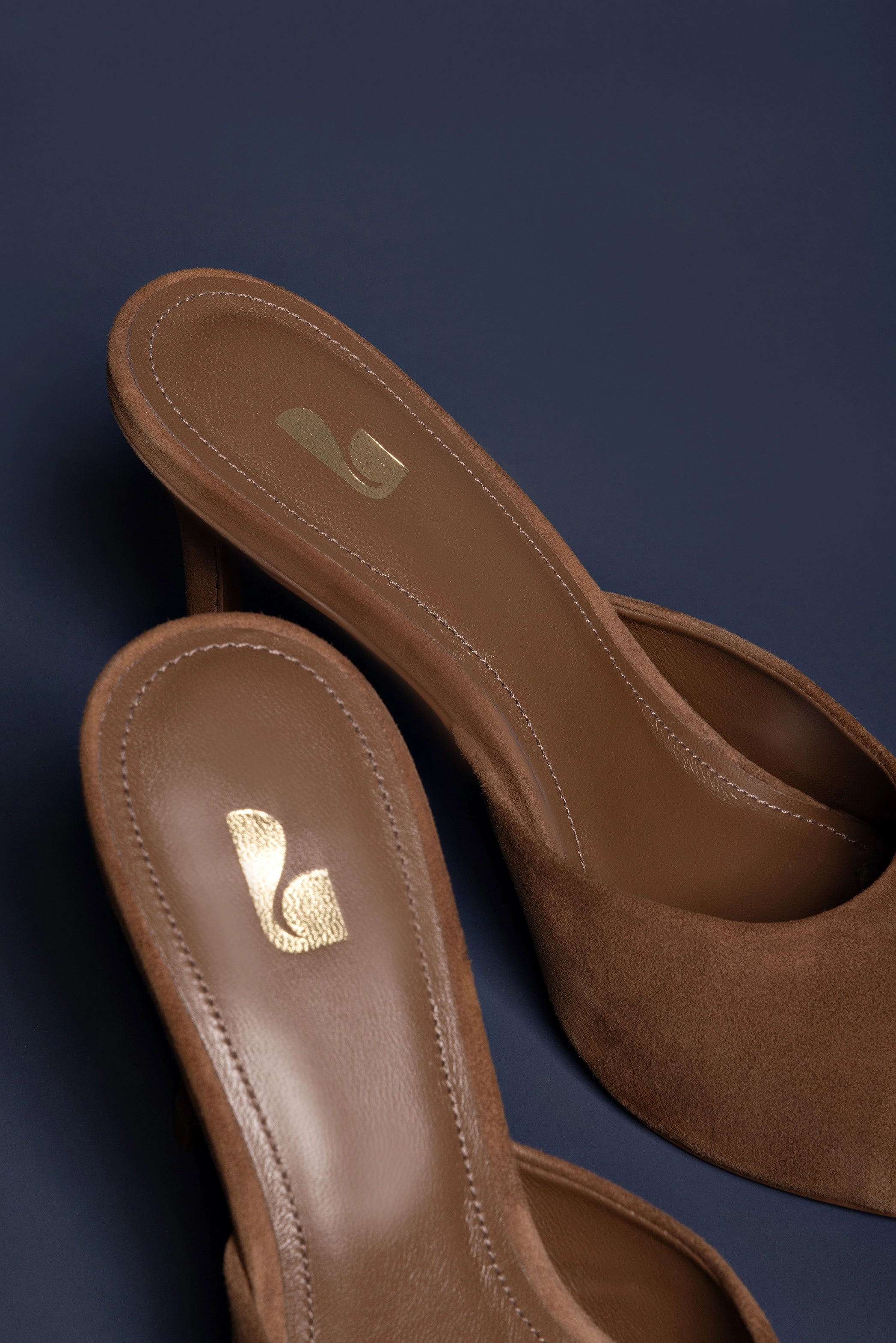 With a retro look and feel, the Jasmine Hi Mule in a rich brown suede is one of the season's most versatile new styles, featuring a soft leather lining, deceptively comfortable sky-high heel, and an elegant peep toe silhouette.