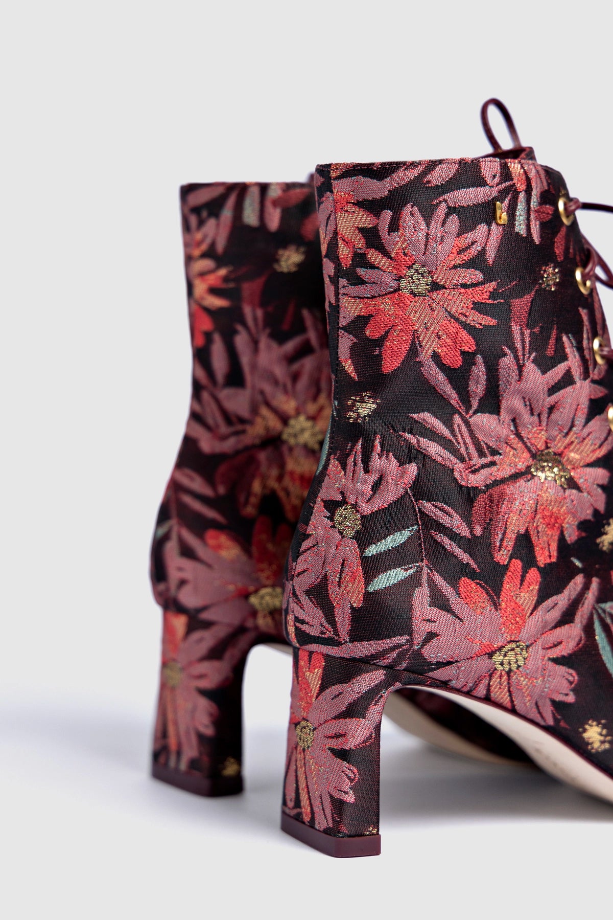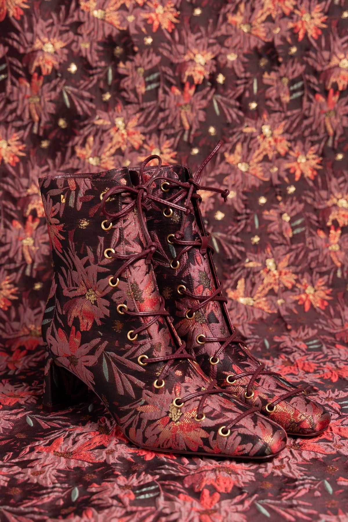 The Alexis boot is reimagined in a rich brocade, featuring warm tones and subtle metallic threads that bring dimension and light to the Autumn Garden pattern. The mid-calf height, comfortable block heel, and front lacing create a flattering, distinctive silhouette that transitions effortlessly from day to night.