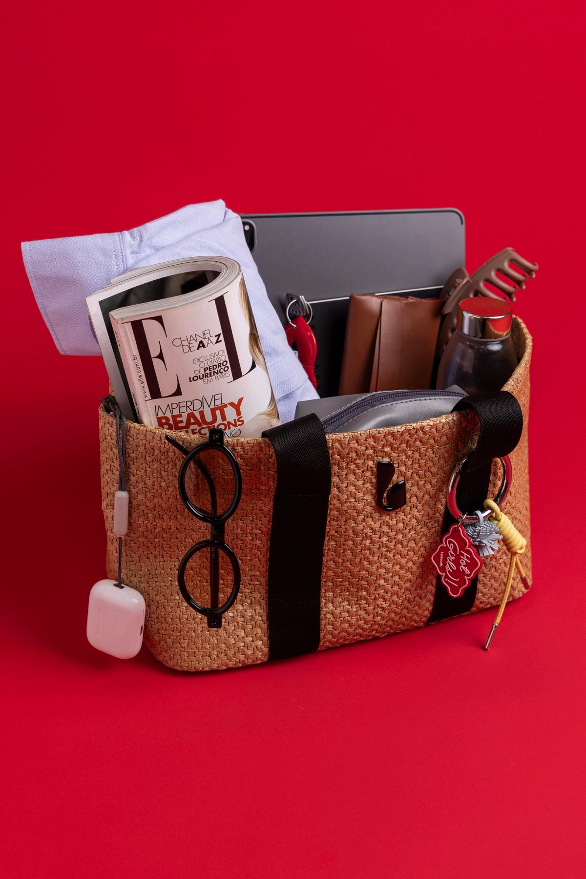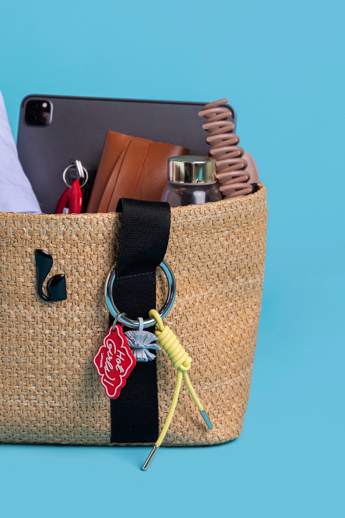 The Americana Tote brings a cool, laid-back feel to everyday style. Crafted in handwoven raffia with sporty straps and a statement key-ring charm, it blends practicality with a modern edge. Spacious, lightweight, and built for real life, it fits your laptop, daily essentials, and then some—making it the ultimate carry-all for city days, airport runs, and weekend plans.