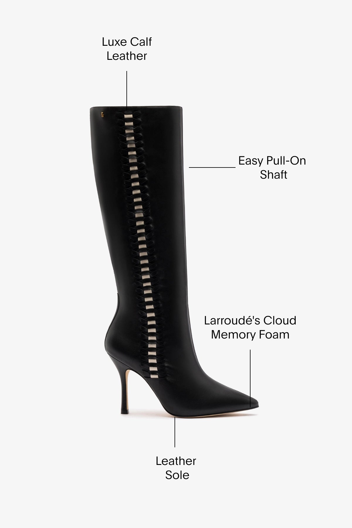 With the luxe look of a classic black with ivory leather stitched detail, the Kate heeled boot is one of Larroudé's year-round options—a pointed toe set on a sleek heel for a mix of elegance and edge.