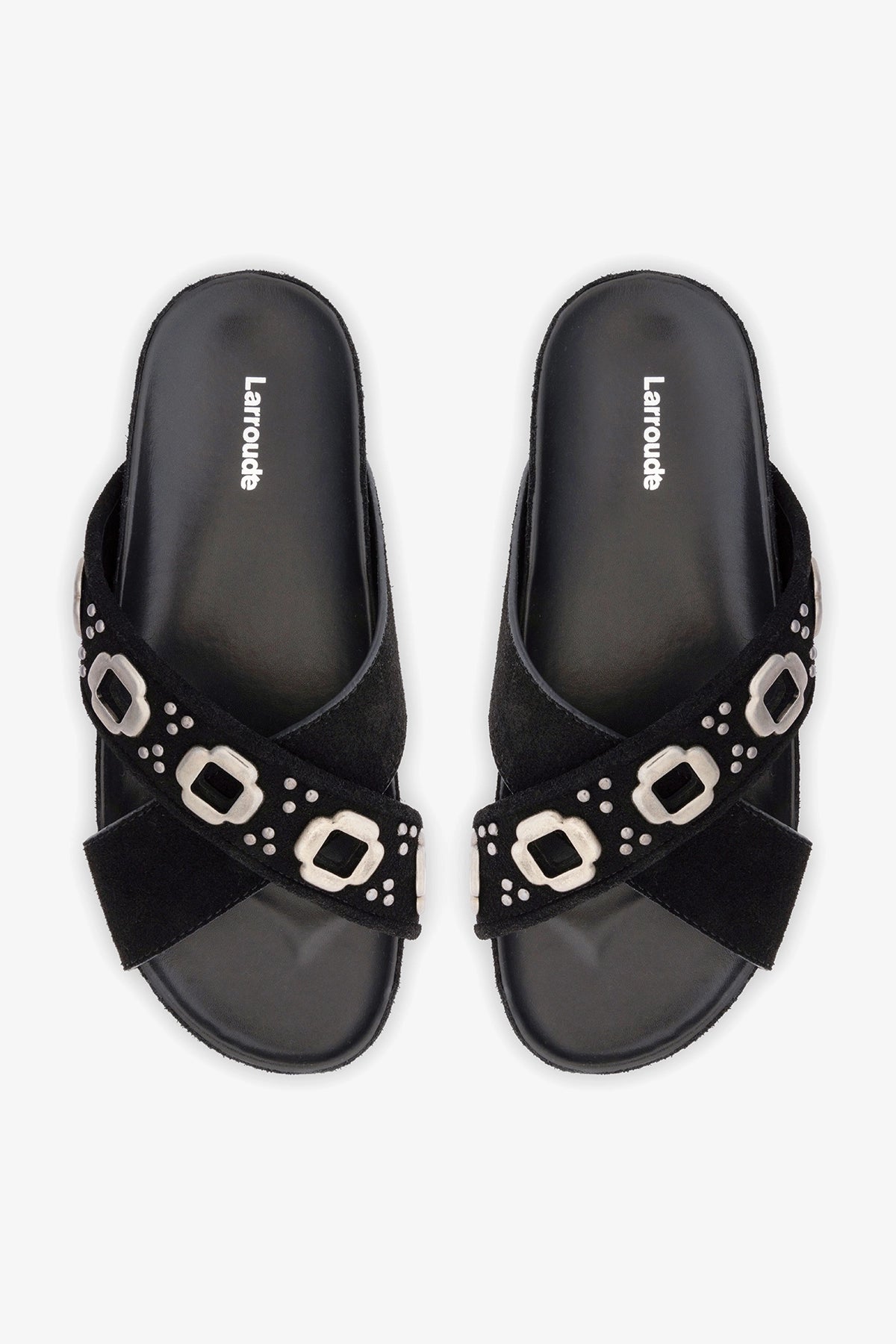 The Milan Slide is your elevated everyday statement piece. Reimagined in plush suede with crisscross straps, it defines effortless style with attitude. The metallic details frame the shoe, injecting a rock-chic edge into your comfort, making it essential for any season.